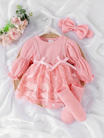 1pc Baby Girl Elegant Lace Mesh Long Sleeve Romper + Headband + Socks, Autumn/Winter NB00083