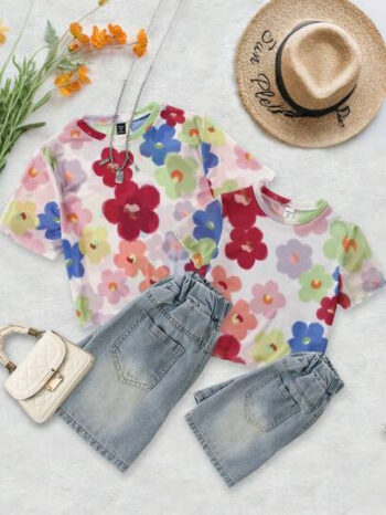 1pc Tween Girl Fashion Casual Colorful Watercolor Floral Print Fitted Short Top, Summer Holiday Floral T-Shirt (Mommy And Me Matching Sold Separately) TG-8-12-00006