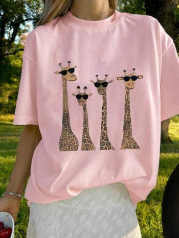 1pc Girls Long Sleeve Giraffe Print Pullover Tee Shirt, Pink, Comfortable & Fashionable Summer Top For Young Students TG-8-12-00085