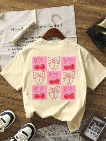 1pc Tween Girls Pink Bow Graphic Short Sleeve T-Shirt, Student Young Tween Girl Casual Comfortable Fashion Summer Top TG-8-12-00090