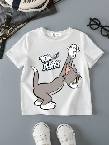 TOM & JERRY X SHEIN Young Boy Cat Print Round Neck Casual Short Sleeve T-Shirt, Suitable For Summer YB00065