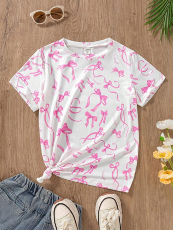 Tween Girl Bow Print Round Neck Short Sleeve T-Shirt, Summer TG-8-12-00046