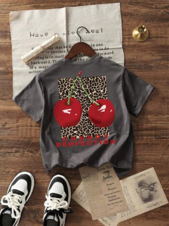 Tween Girls Cute Cherry Print Crew Neck Short Sleeve T-Shirt, Summer Top TG-8-12-00092