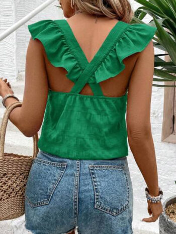 Tween Girls Green Polyester Casual Summer Top With Ruffle Sleeves And Open Back Design
