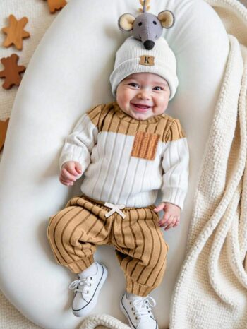 SHEIN Baby Boy 3pcs Set: Adorable Hat, Long Sleeve Top And Fashionable Casual Pants NB00035