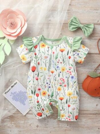 SHEIN Baby Girl Floral Pattern Ruffle Trim Romper NB00033