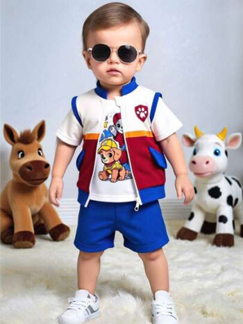 SHEIN Persoplay Kids 3 Pcs Baby Boy Sets, Including Short Sleeve Top, Sports Shorts, And Vest. New Style Features Cute Dog Graphic Round Neck Tee, Blue Sports Shorts, And Sleeveless Vest With Zipper Patchwork. This 3-Piece Set Is Basic & Versatile, Suitable For Summer Wear As Fashionable Loose Casual/Sportswear, Or For Vacation, Outings And Leisure Occasions. BB00042