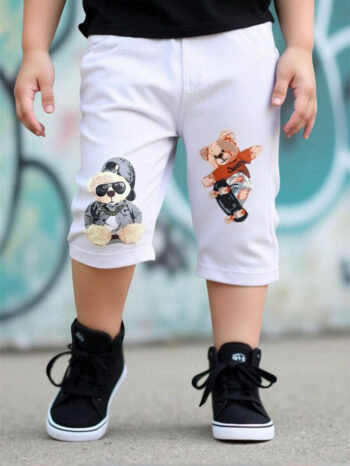 Baby Boy Street-Style Cool Skateboarding Bear Pattern Print Elastic Waist Wide And Comfortable Denim 3/4 Pants BB00021