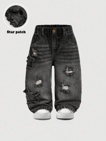 SHEIN Toddler/Baby Boys Casual Cute Vintage Star Design Fringed Ripped Loose Fit Blue Jeans,For Toddler Fall/Winter Outdoor Wear And Daily Wear Outfits BB00063