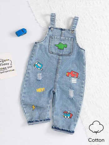 SHEIN Playful Pals 1pc Baby Boys’ Denim Romper Vintage Cute Cartoon Dinosaur & Car & Letter Print Overall Jumpsuit, Casual Matching Tee/Shirt, Adjustable Straps, Summertime Fashionable Daily Wear BB00006