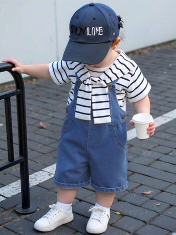SHEIN 3pcs/Set Infant Boys Casual Multi-Functional Comfortable Raincoat, Striped Crew Neck Short Sleeve T-Shirt And Adjustable Bib Denim Overalls, Suitable For Commute, School, Vacation, Sports, Spring/Summer, 6M-3T, Baby Clothes Outfits For Baby Boy Boy Baby Clothes Baby Boys Sets Boys Clothes Baby Baby Clothes For Boy Boy Clothes For Baby Summer BB00046