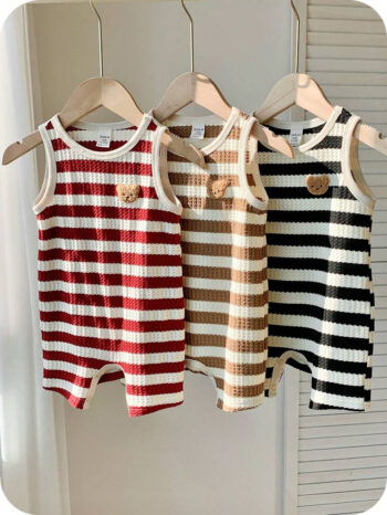 SHEIN 3pcs/Set Newborn Baby Boy Cute Summer Casual Knitted Striped Bear Pattern Sleeveless Romper Baby Clothes Unisex Summer Clothes For Toddler Toddler Clothes Summer BB00093