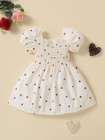 SHEIN Baby Girl Heart Print Shirred Puff Sleeve Dress BG00017
