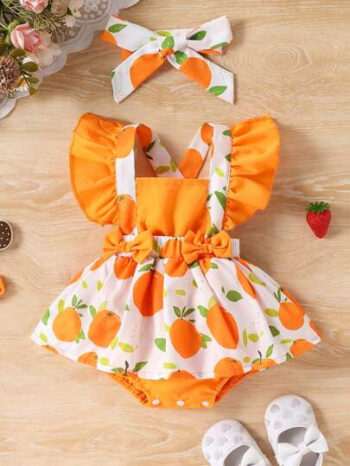 SHEIN Baby Girl Sweet Donut & Candy Printed Sleeveless Dress With Bowknot Decoration, Ruffled Hemline For Summer Baby Romper Dress BG00008