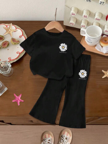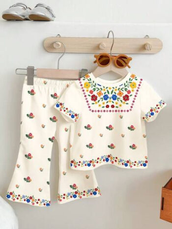 SHEIN Cute Colorful Floral Baby Girl Casual Crew Neck Short Sleeve T-Shirt And Flared Pants Set, Suitable For Spring & Summer BG00084