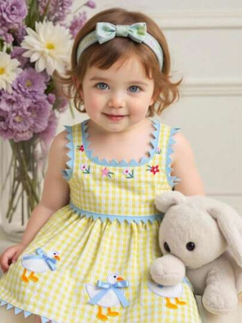 Souflis Souflis Baby Girls’ Casual Cute Country Style Sweet Sleeveless Dress, Ditsy Floral Embroidered Trim Ruffled Hem Decorative Duck Design, Summer BG00011