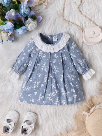 SHEIN Newborn Baby Girls’ Floral Print Ruffle Hem Long Sleeve Dress NB00024