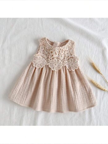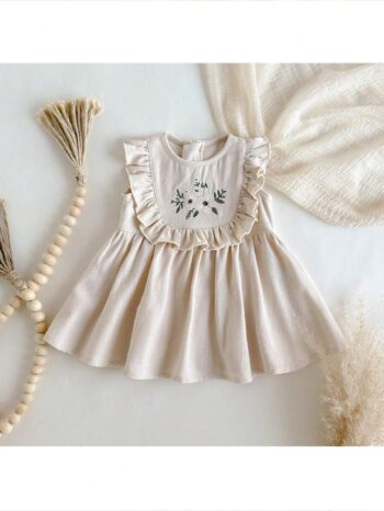 SHEIN Newborn Baby Girl Round Neck Sleeveless Front Button Embroidered Simple Casual Dress NB00042