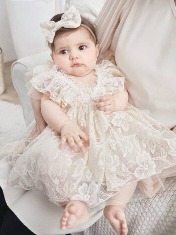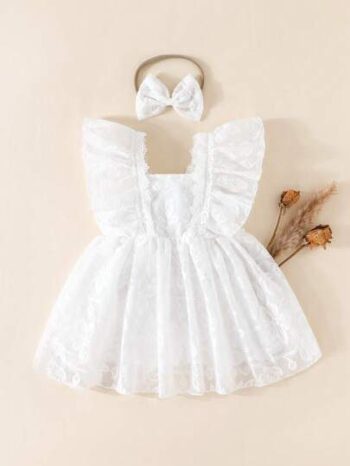 SHEIN 2pcs/Set Newborn Baby Girl Sweet Elegant Princess Lace Mesh Dress + Bowknot Headband, 0-3 Months, Spring/Summer New, Infant Baby Girl Outfit, Suitable For Party, Photo Shoot, Wedding As Flower Girl NB00075