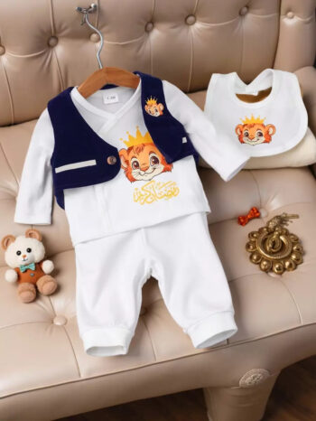 SHEIN 4-Piece Newborn Baby Boy Spring/Summer Adorable Crown, Lion Print Slogan Comfortable White Shirt Long Sleeve Top & Elastic Waist Pants & Velvet Gold Bowtie Blue Waistcoat & Bib, Gentleman Outfit Suitable For Casual, Formal Occasions Like Birthday Party, Evening Event, Wedding, Christening, Ceremony And Anniversary NB00092