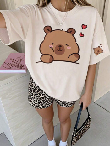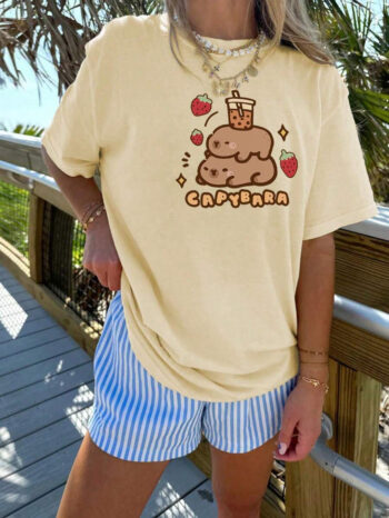 Girls & Teens Student Casual Printed Round Neck Short Sleeve T-Shirt, Apricot Color, Summer Top TG-8-12-00075