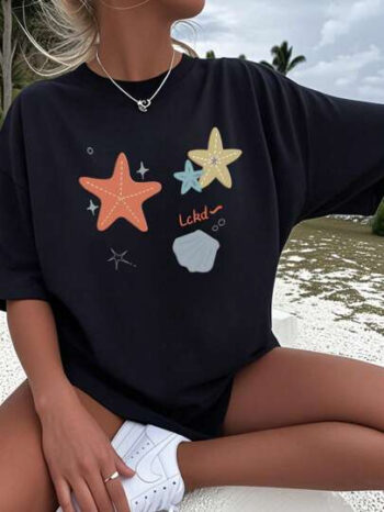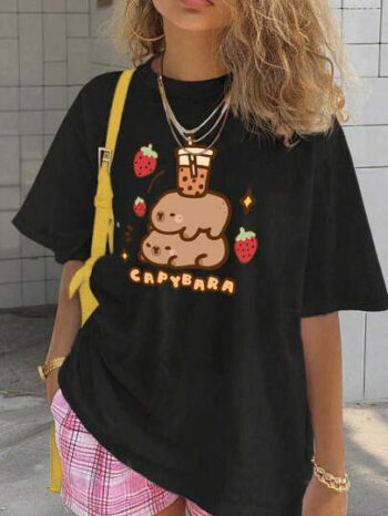 Girls & Teenagers’ Students Casual Print Round Neck Short Sleeve T-Shirt, Black, For Summer TG-8-12-00079