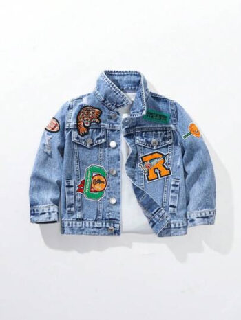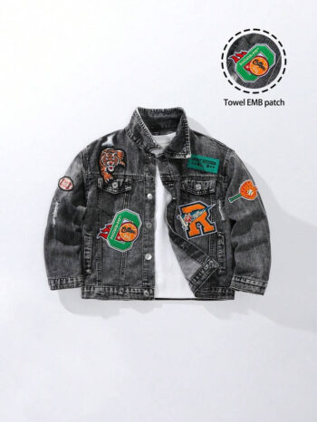 SHEIN Distressed Letter & Tiger Embroidered Patch Washed Light Blue Denim Jacket, Casual And Comfortable Streetwear For Young Boys, School, Campus, College YB00060