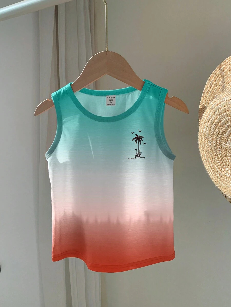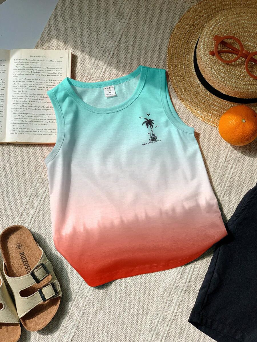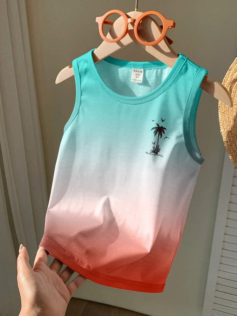1 Pc Young Boys Casual Collegiate Sleeveless Top, Versatile, Soft & Comfortable, With Gradient Tropical Plant Pattern, Suitable For Daily Wear, School, Travel, Sports, Vacation, Spring/Summer YB00029