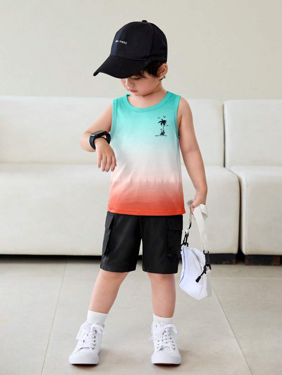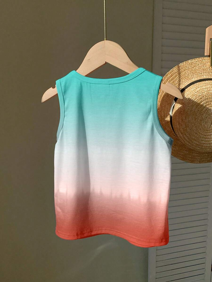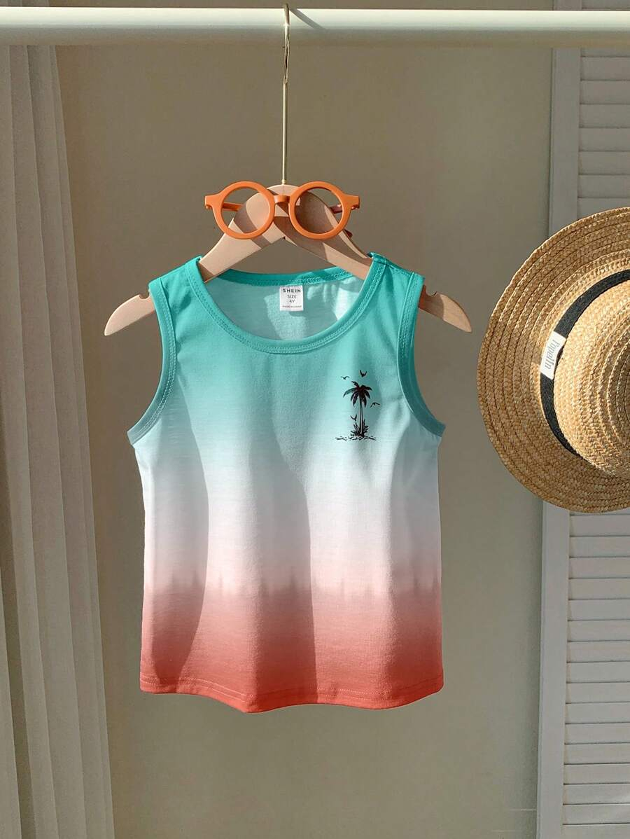 1 Pc Young Boys Casual Collegiate Sleeveless Top, Versatile, Soft & Comfortable, With Gradient Tropical Plant Pattern, Suitable For Daily Wear, School, Travel, Sports, Vacation, Spring/Summer YB00029