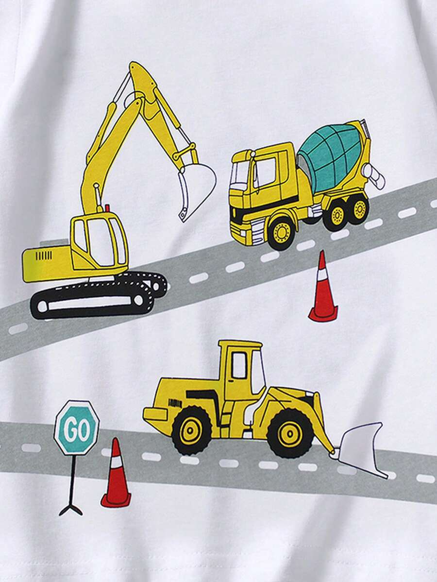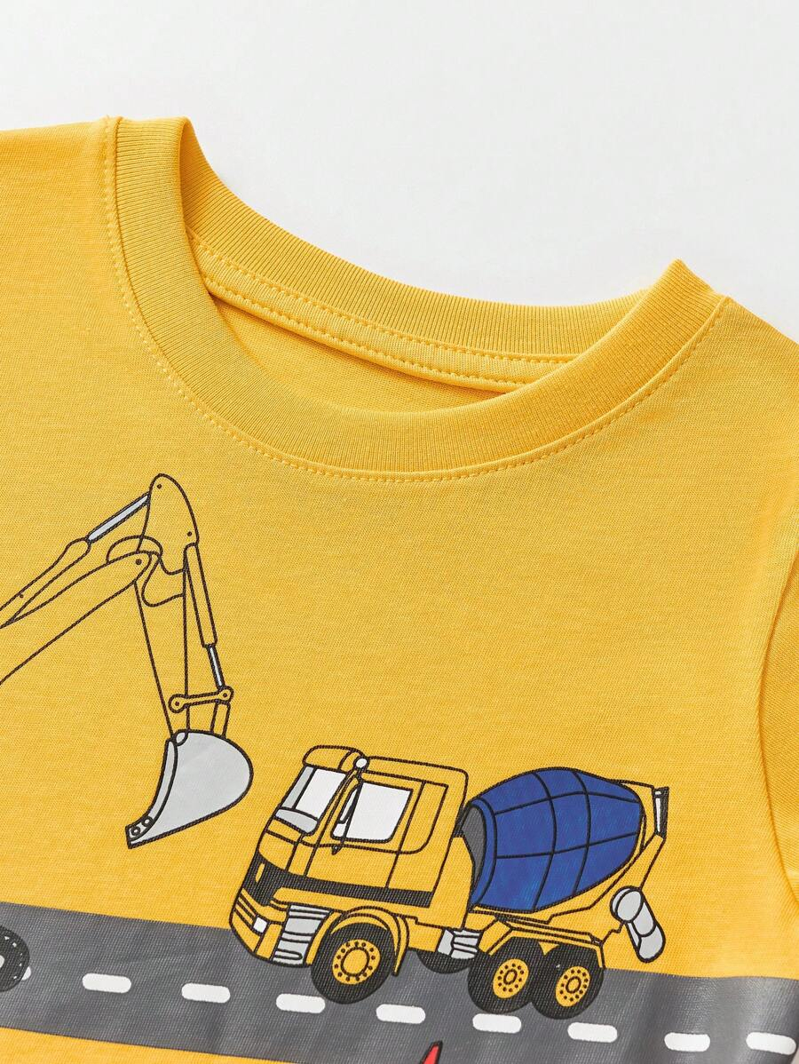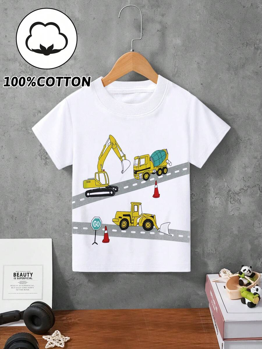 1pc Young Boy Casual Cartoon Excavator Print Round Neck Short Sleeve T-Shirt, For Spring/Summer YB00017