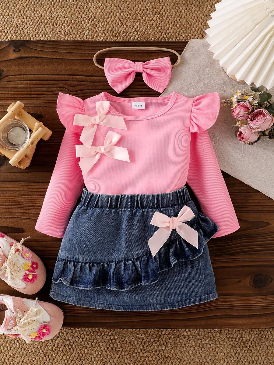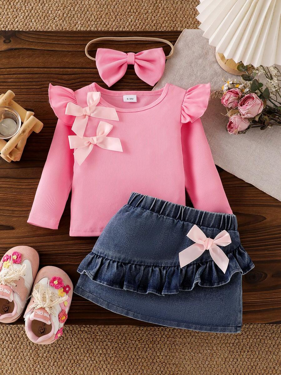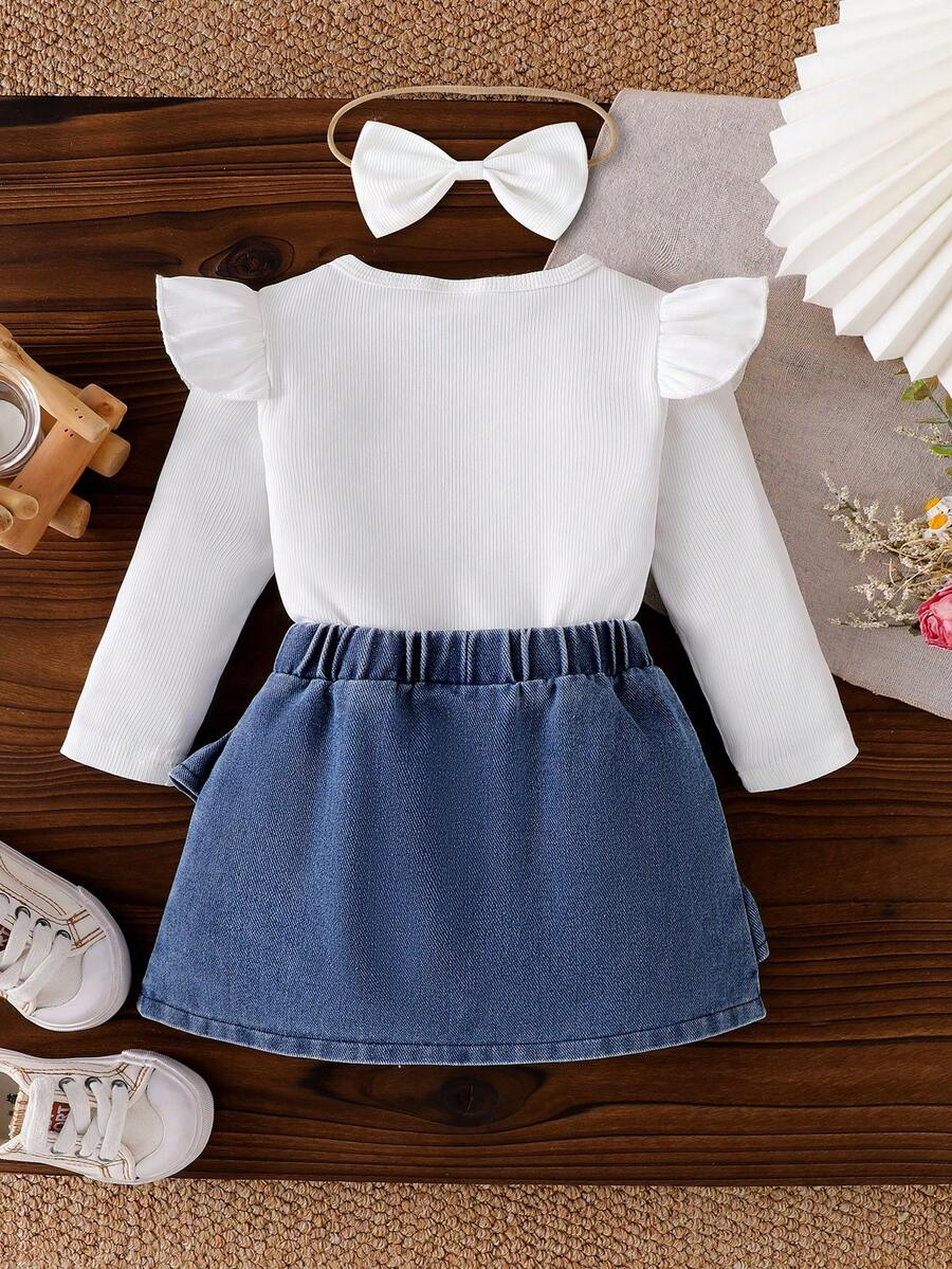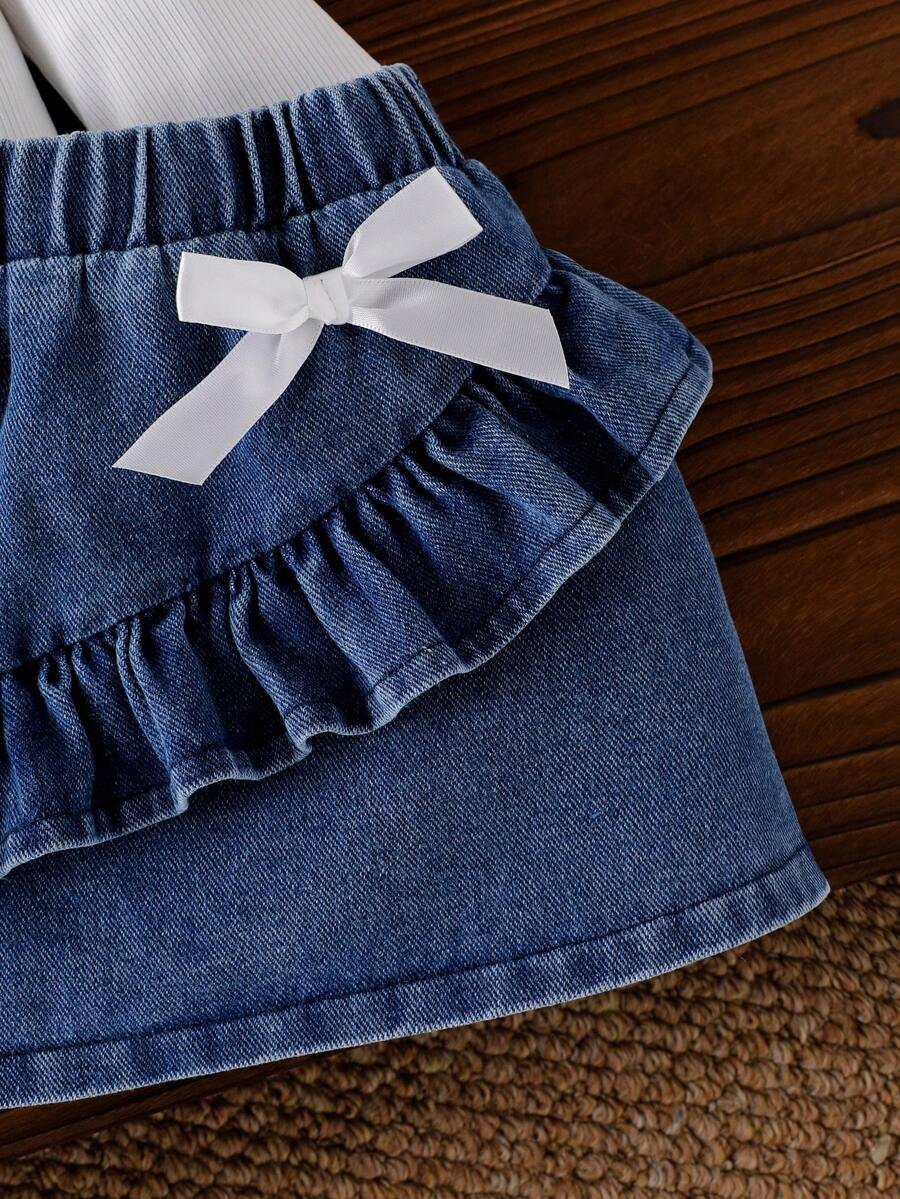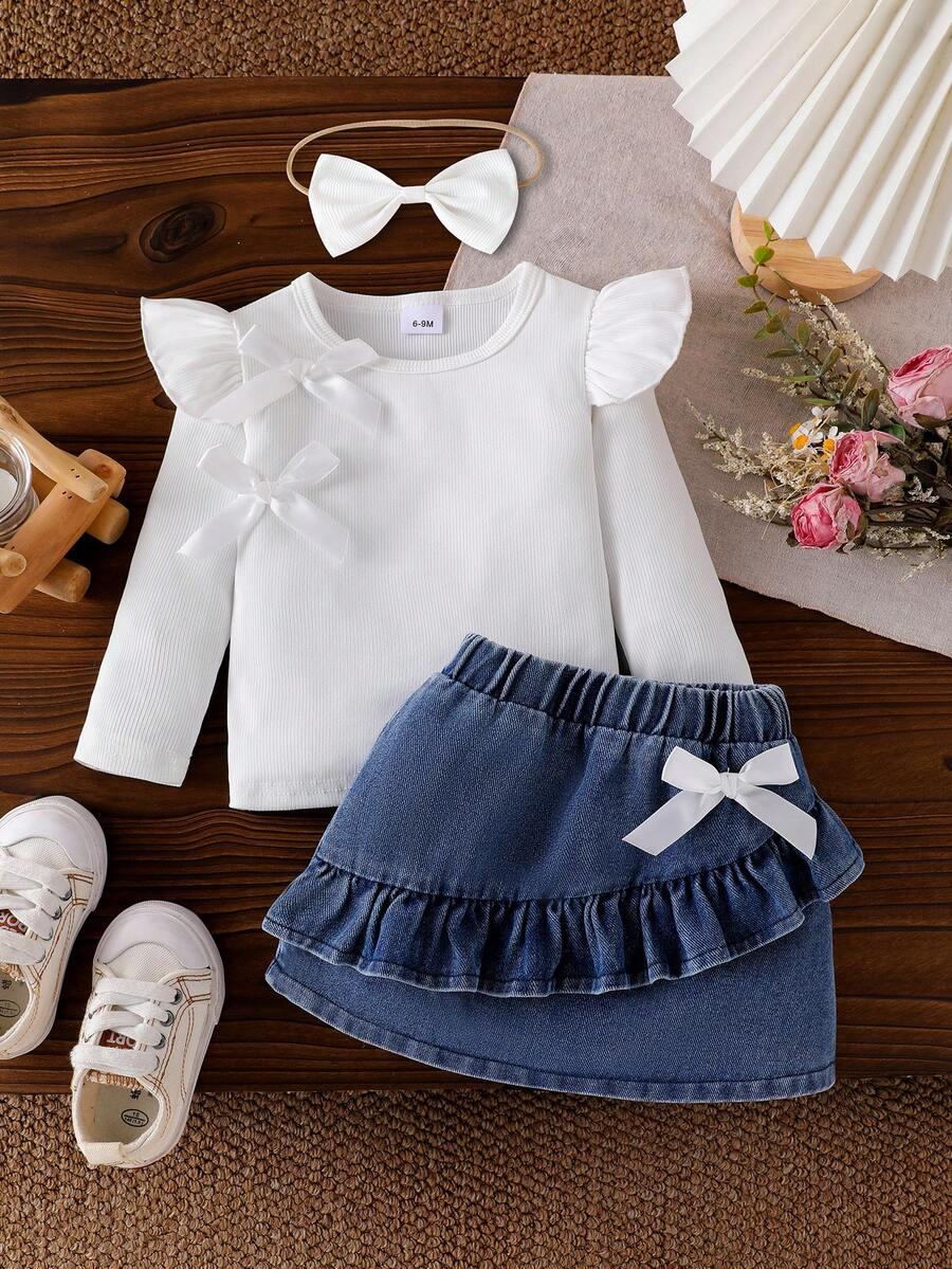 2pcs Baby Girl 3D Bow Decor White Long Sleeve Top And Denim Skirt With 3D Bow Elastic Waist, With Bow Headband Set WNTD0065