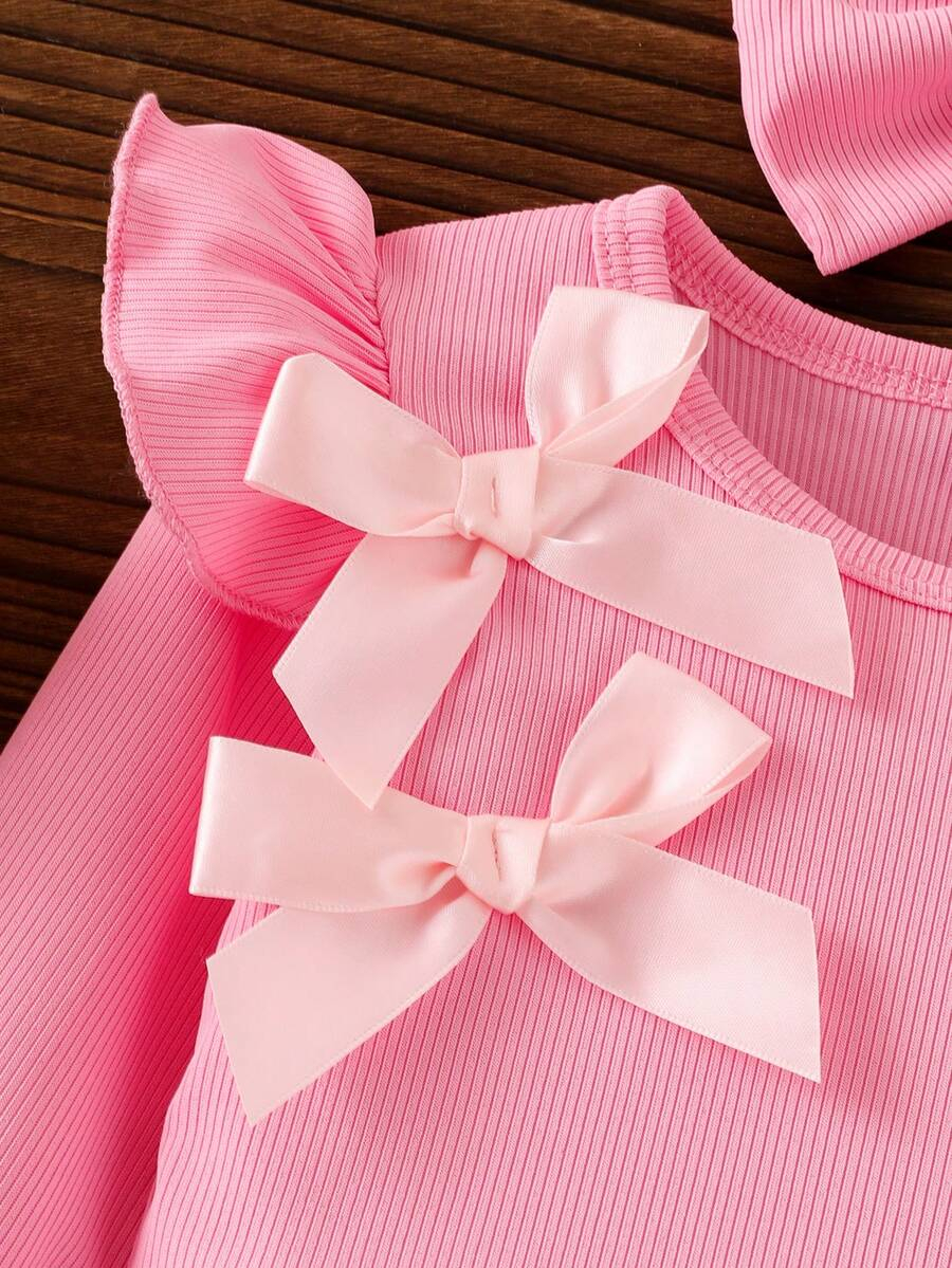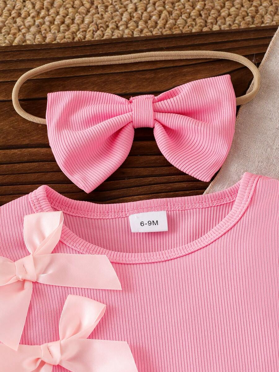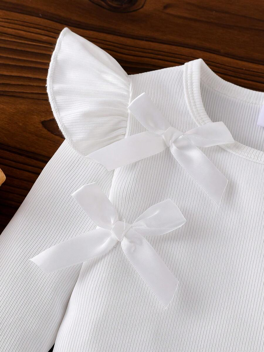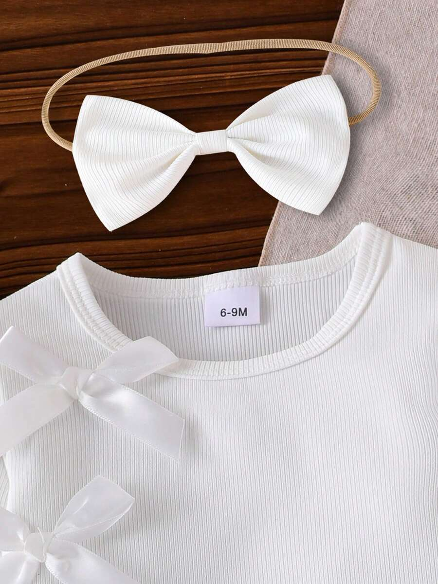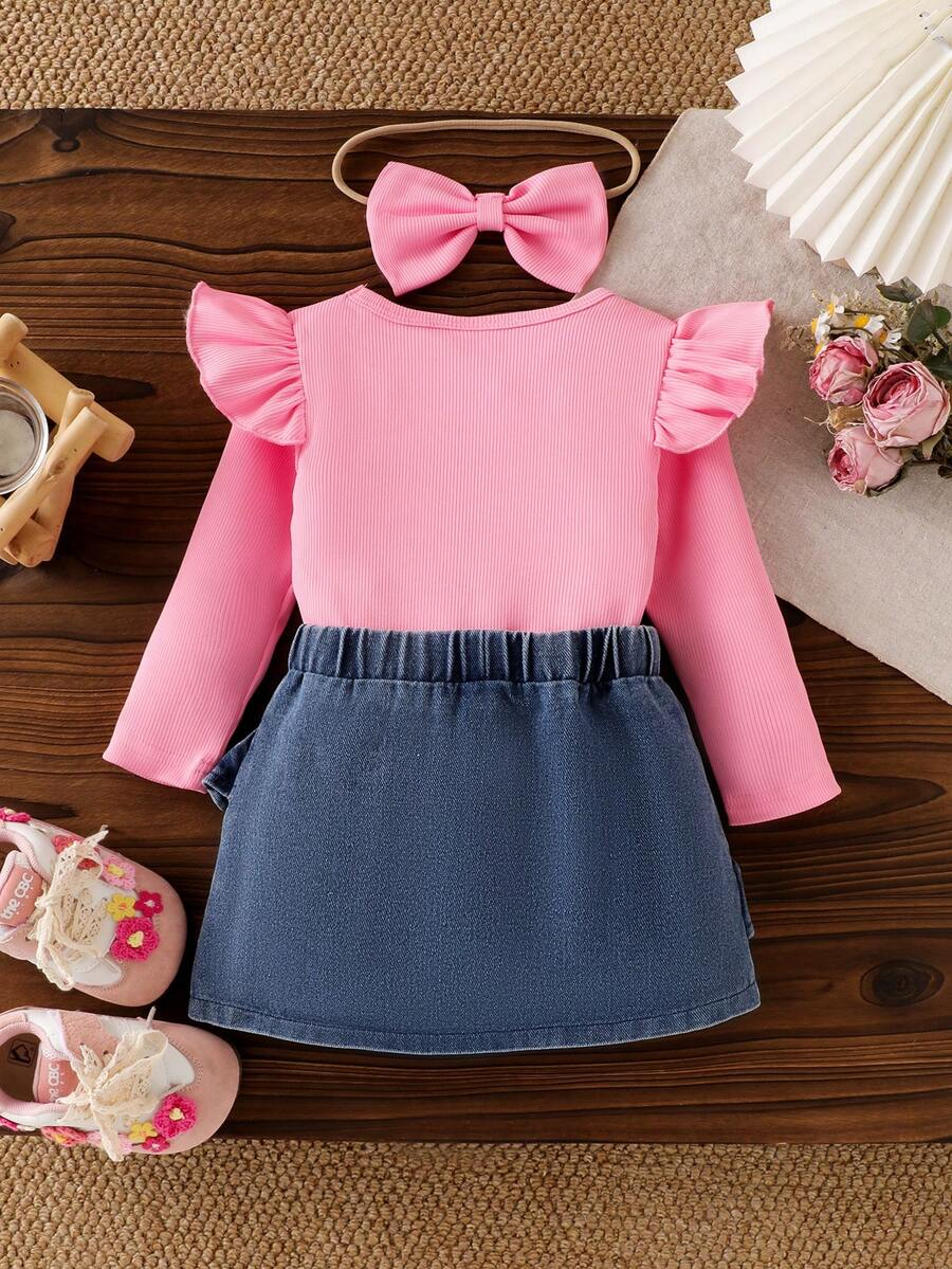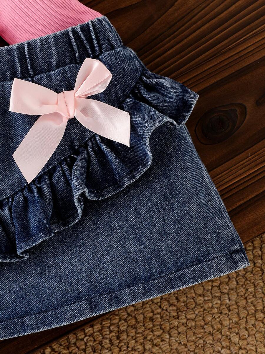 2pcs Baby Girl 3D Bow Decor White Long Sleeve Top And Denim Skirt With 3D Bow Elastic Waist, With Bow Headband Set WNTD0065