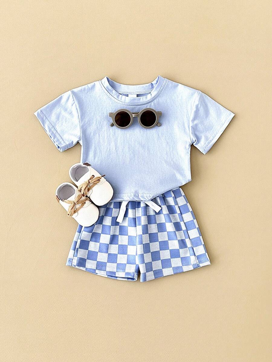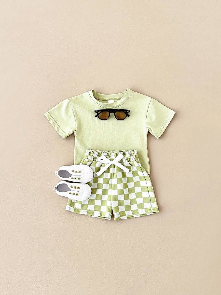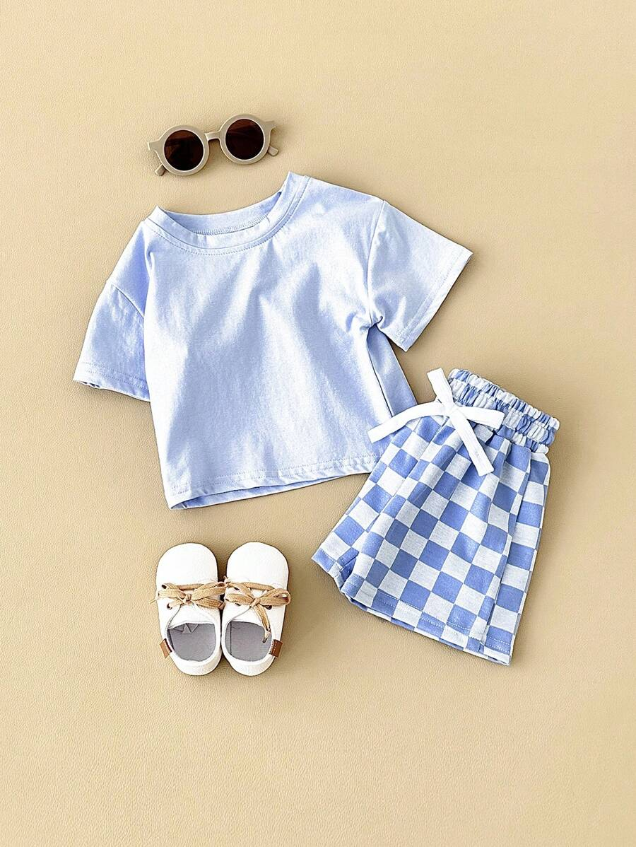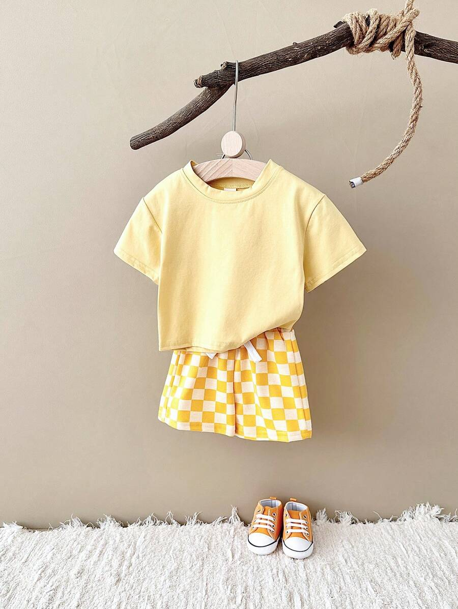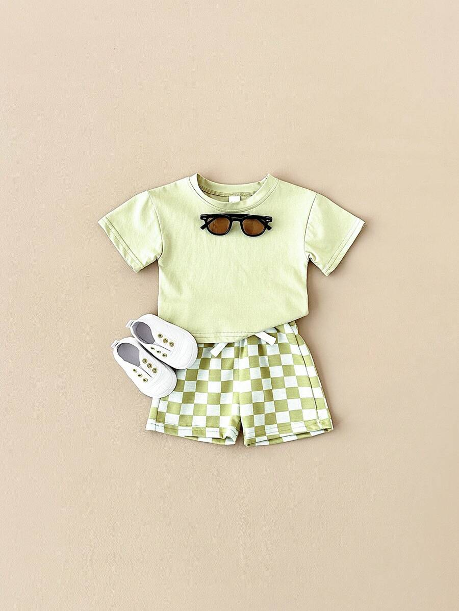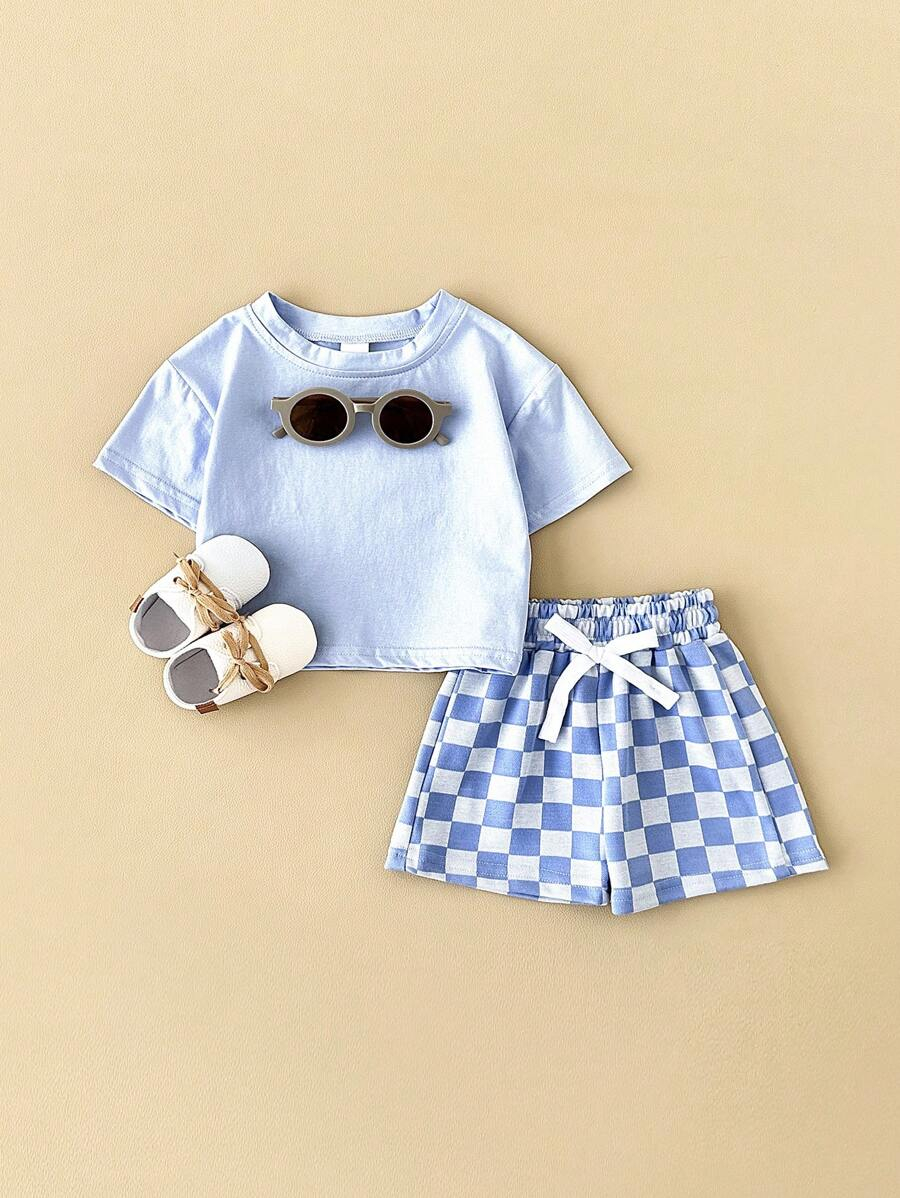2pcs/Set Baby Boy Casual Solid Color Short Sleeve T-Shirt Gingham Double Color Shorts, Summer BB00096