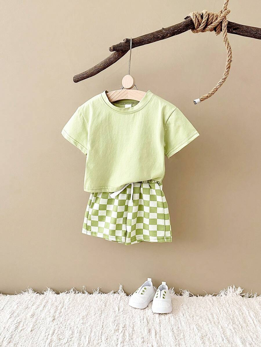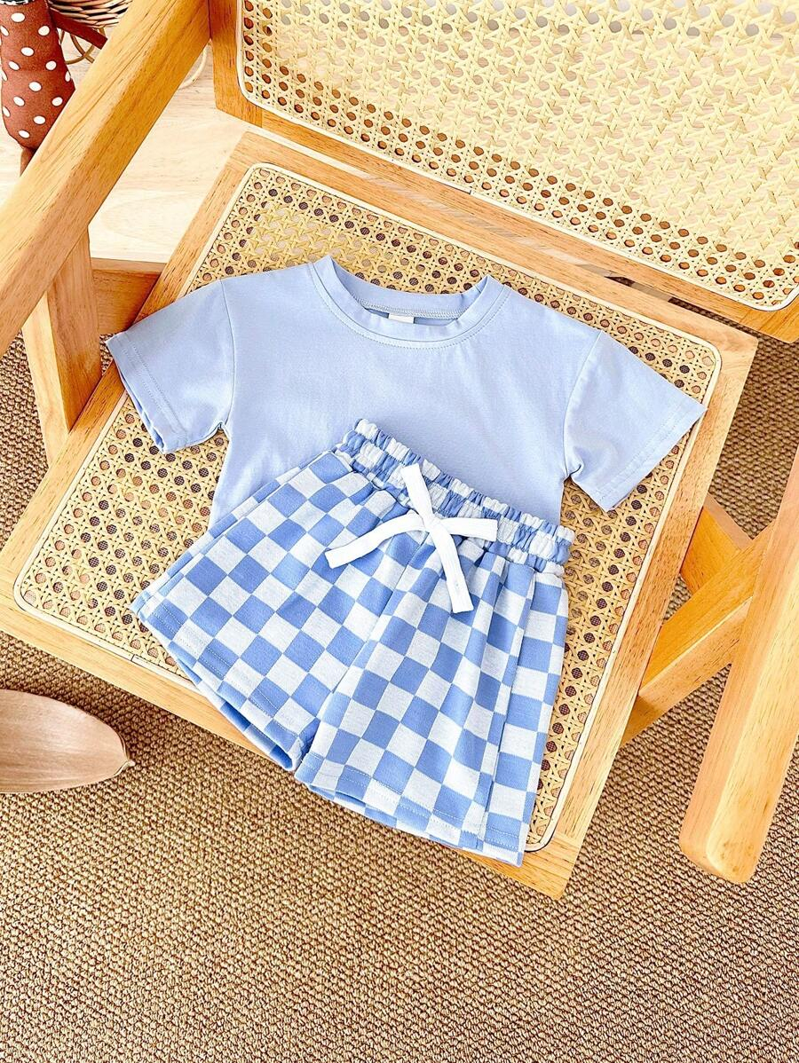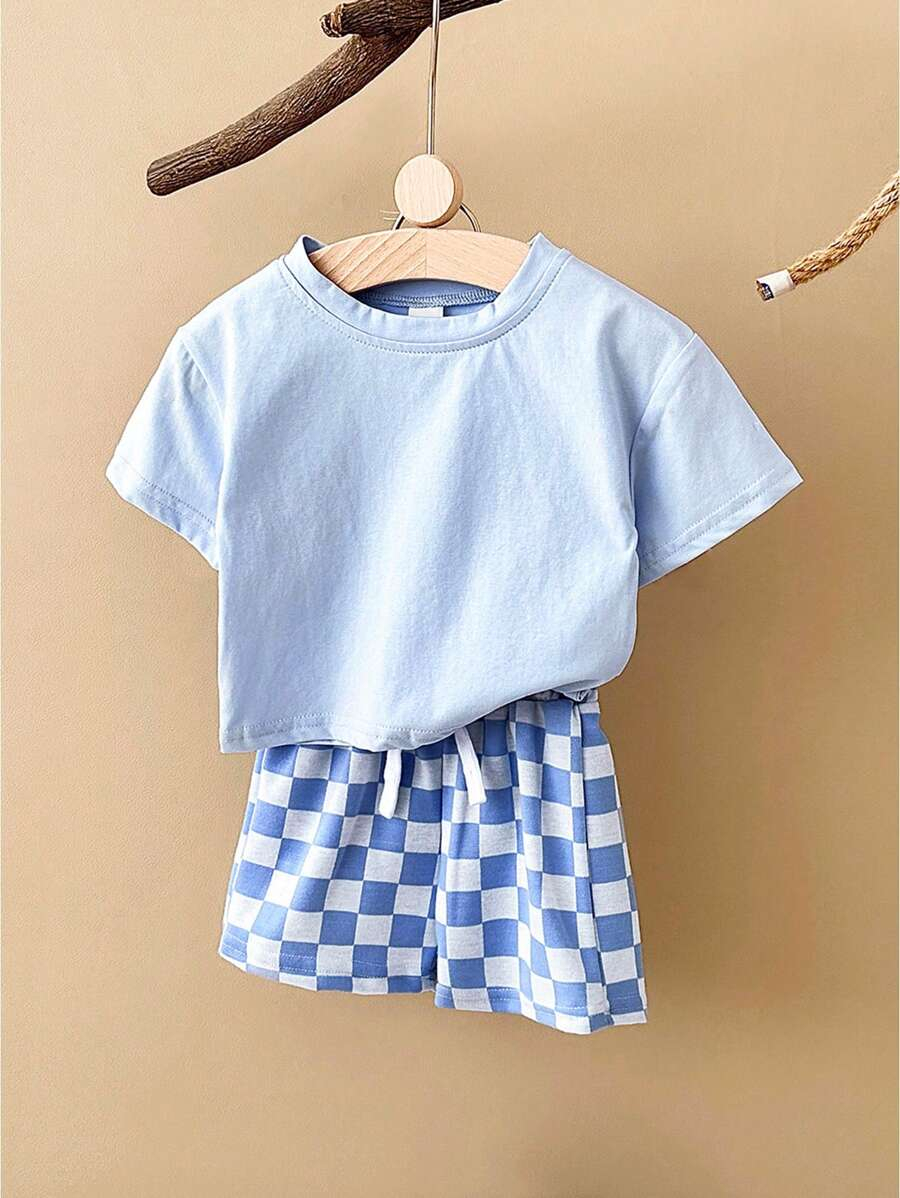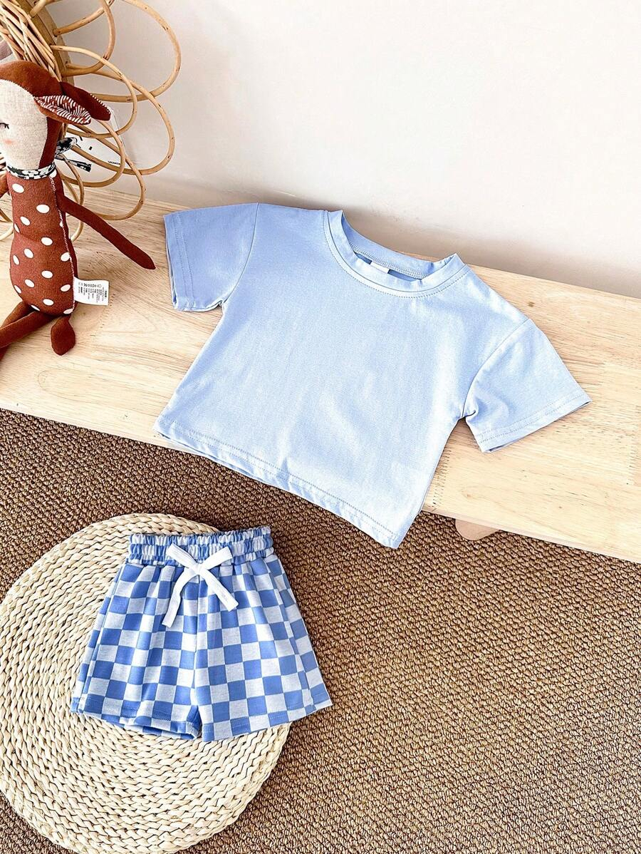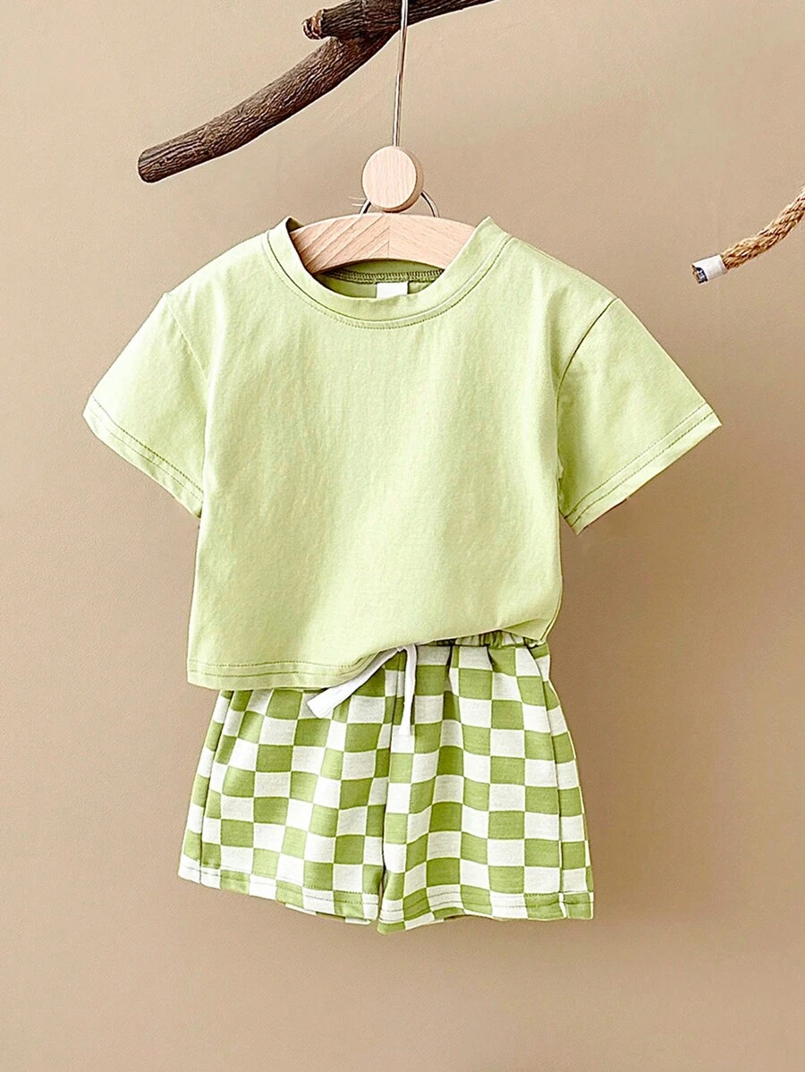 2pcs/Set Baby Boy Casual Solid Color Short Sleeve T-Shirt Gingham Double Color Shorts, Summer BB00096