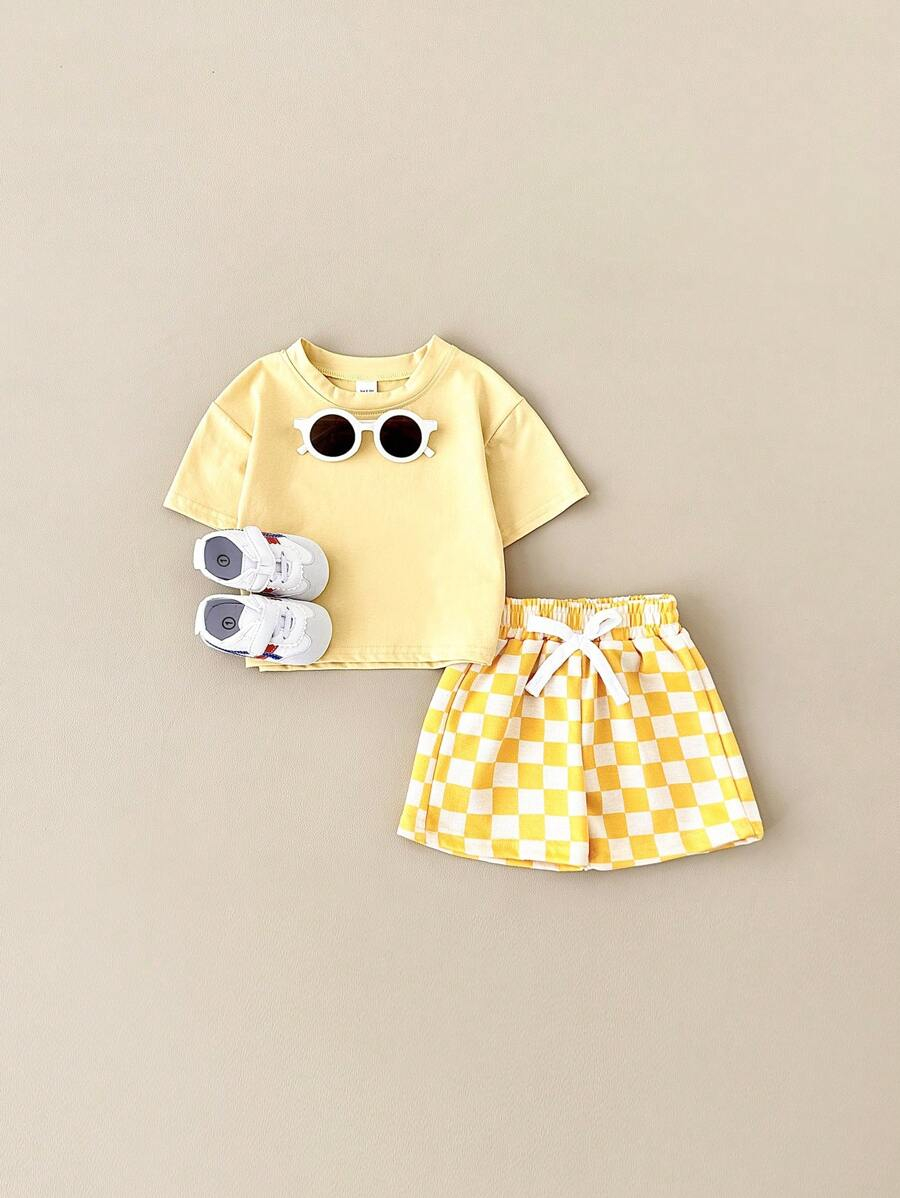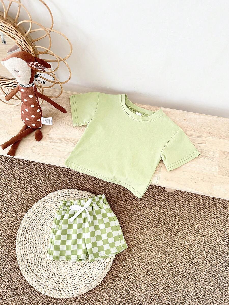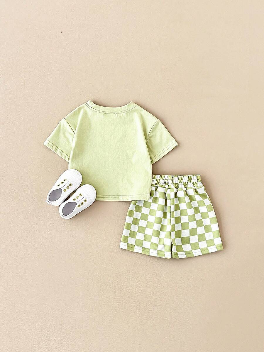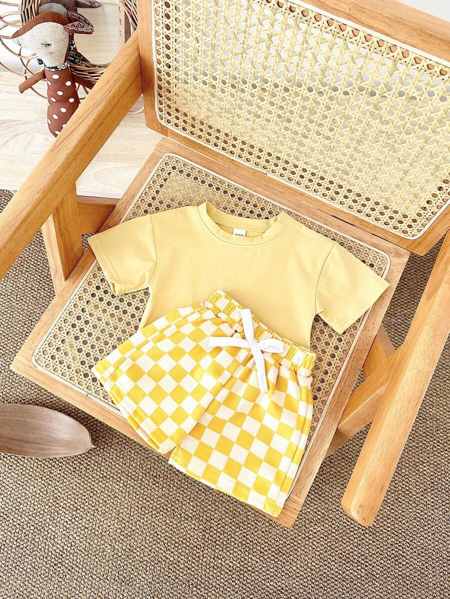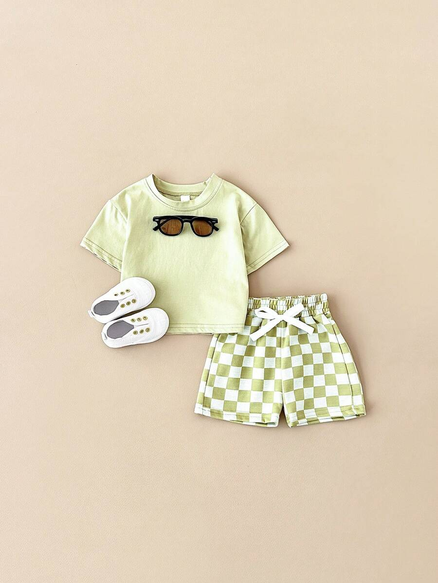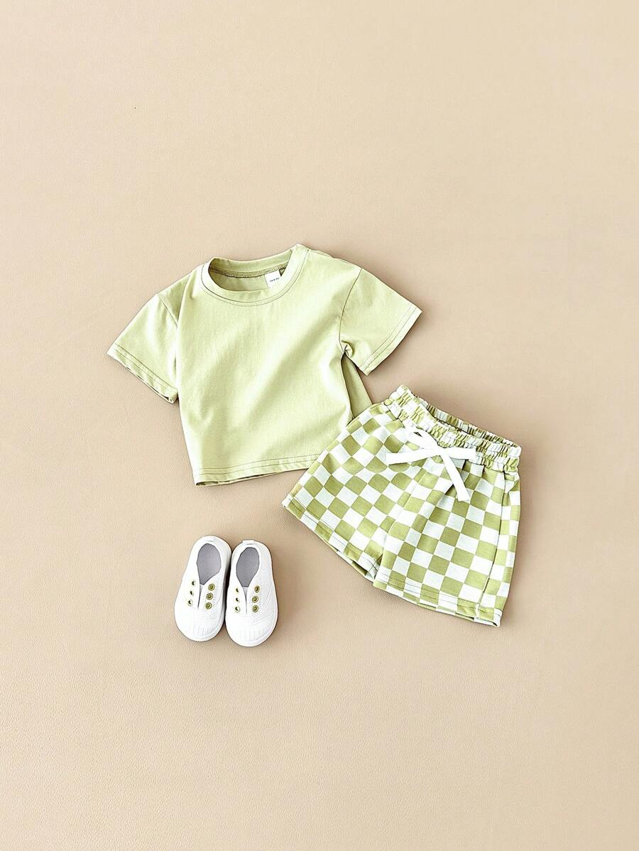 2pcs/Set Baby Boy Casual Solid Color Short Sleeve T-Shirt Gingham Double Color Shorts, Summer BB00096