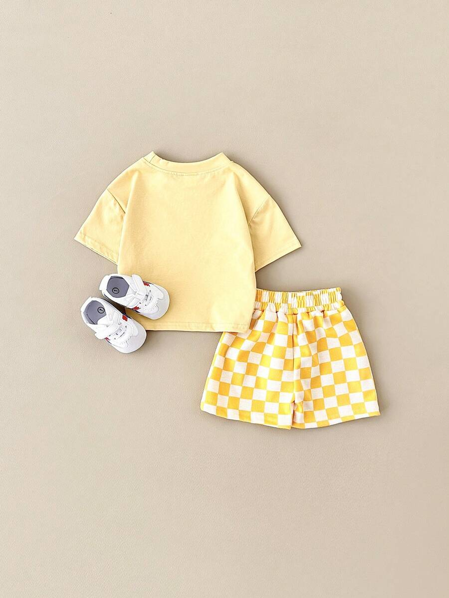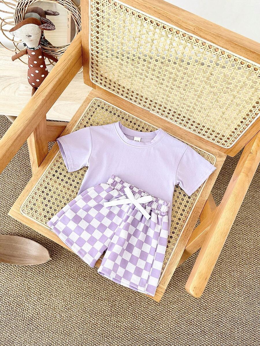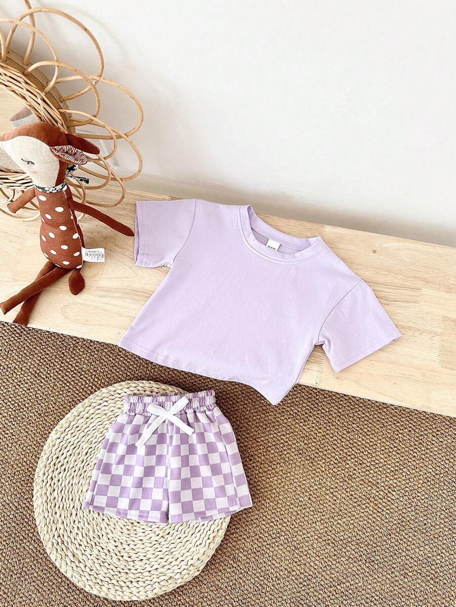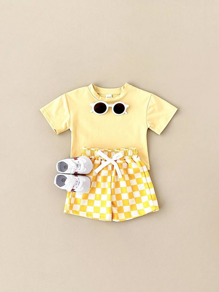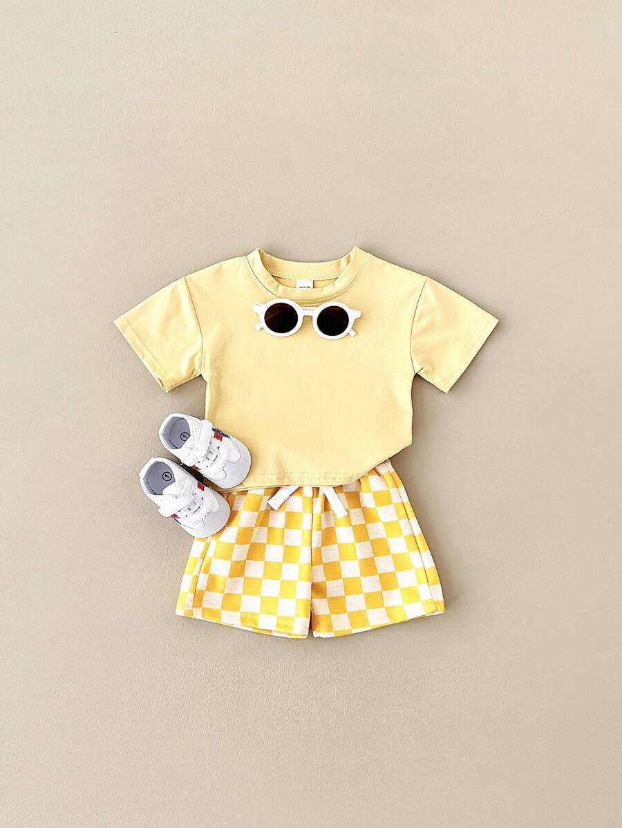 2pcs/Set Baby Boy Casual Solid Color Short Sleeve T-Shirt Gingham Double Color Shorts, Summer BB00096