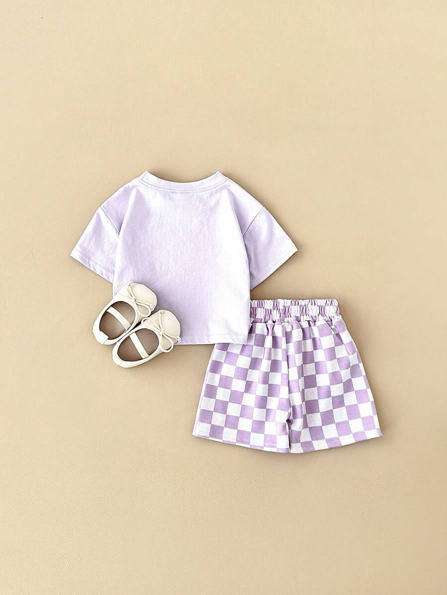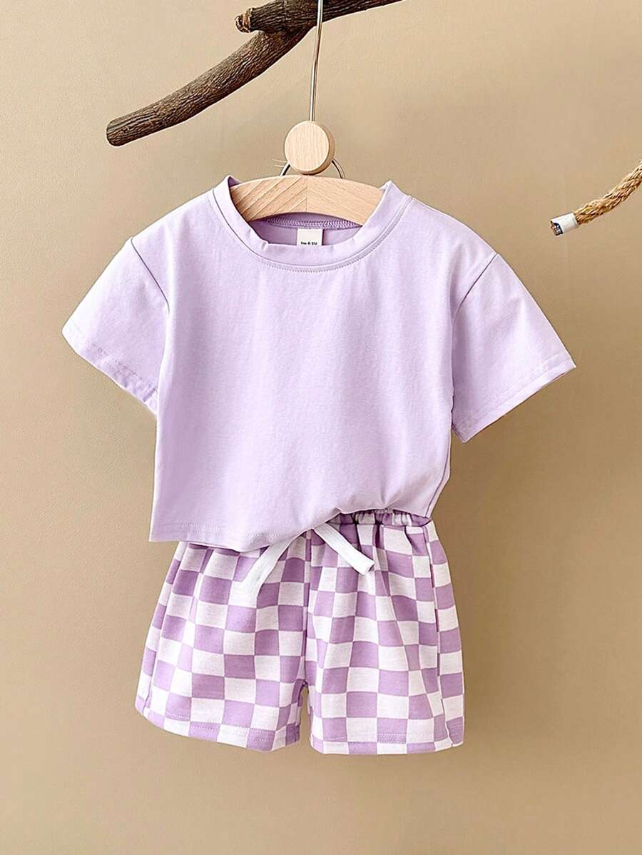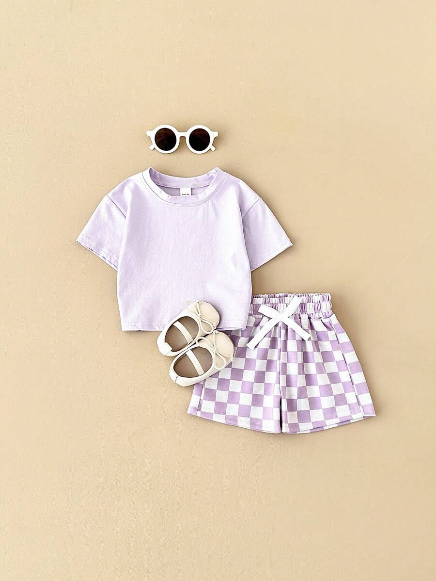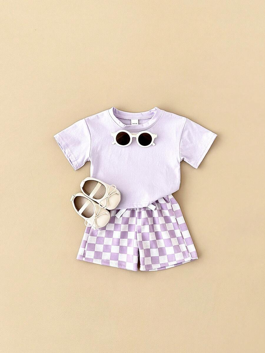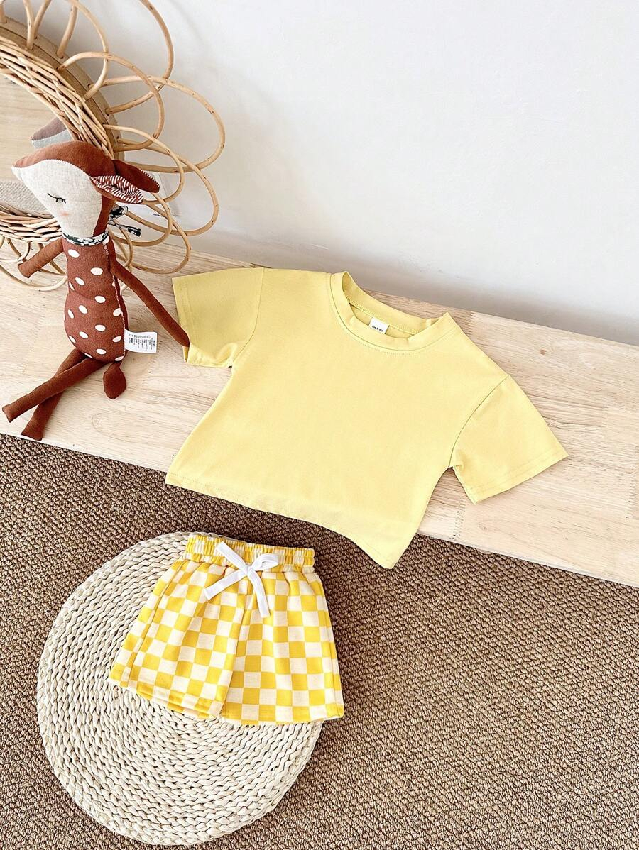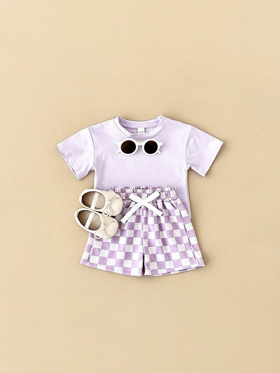 2pcs/Set Baby Boy Casual Solid Color Short Sleeve T-Shirt Gingham Double Color Shorts, Summer BB00096