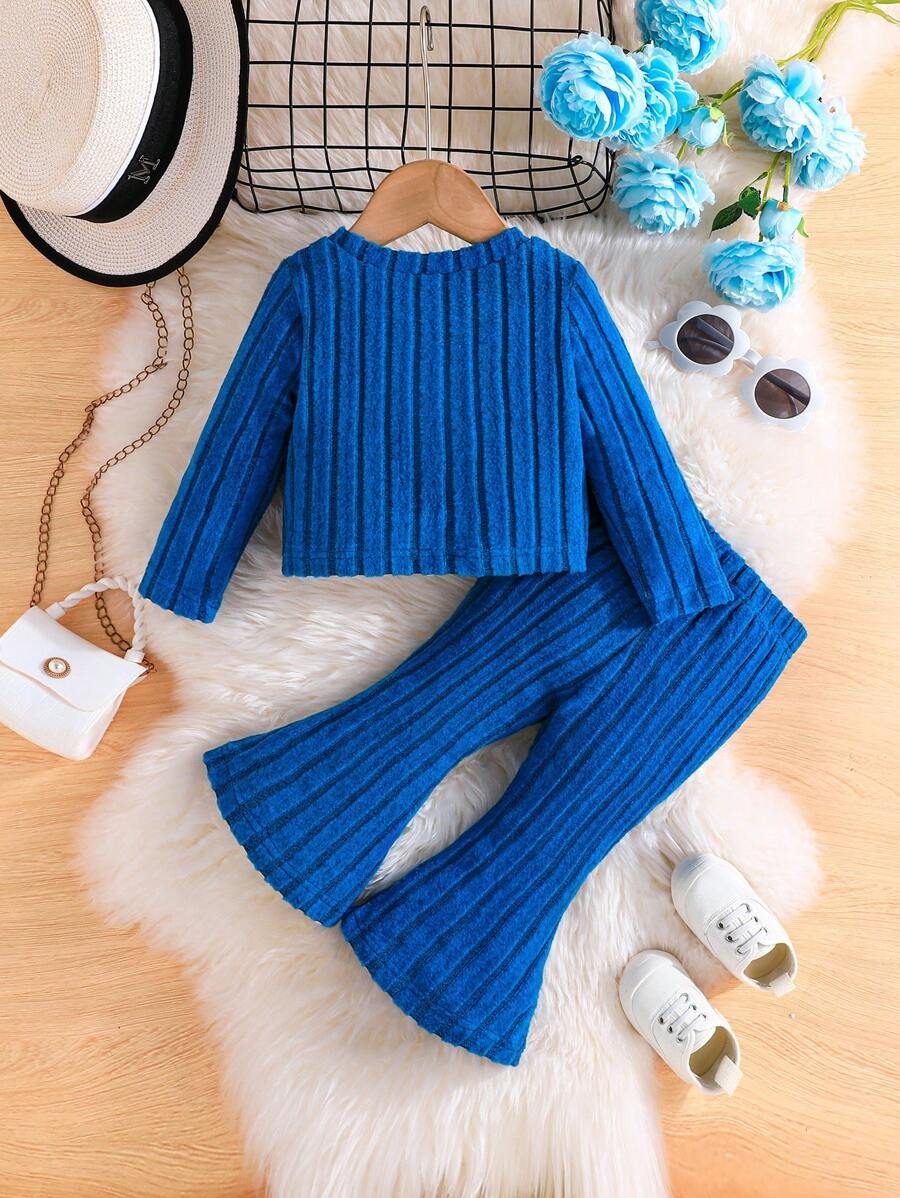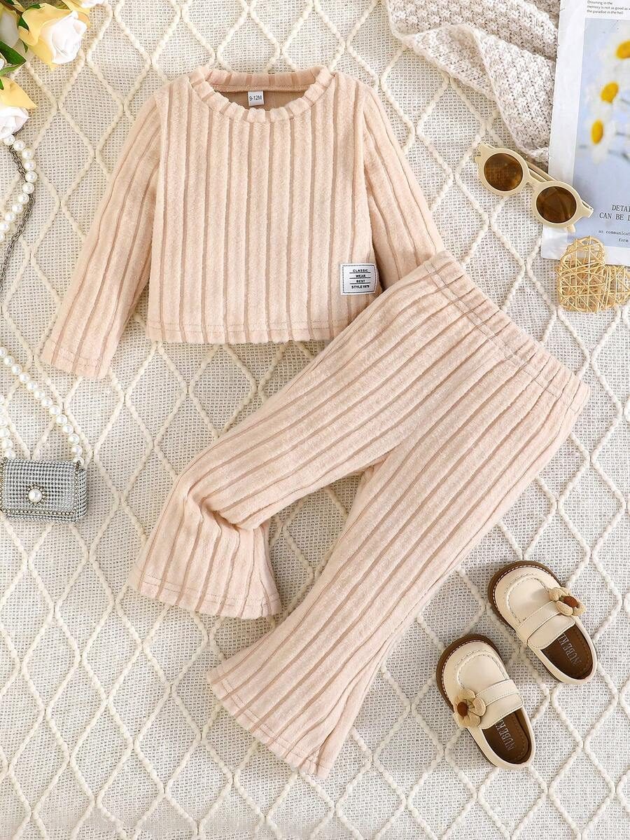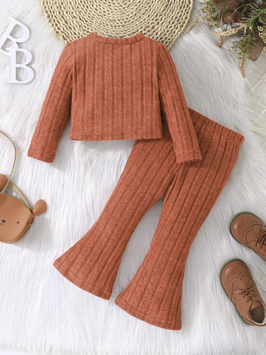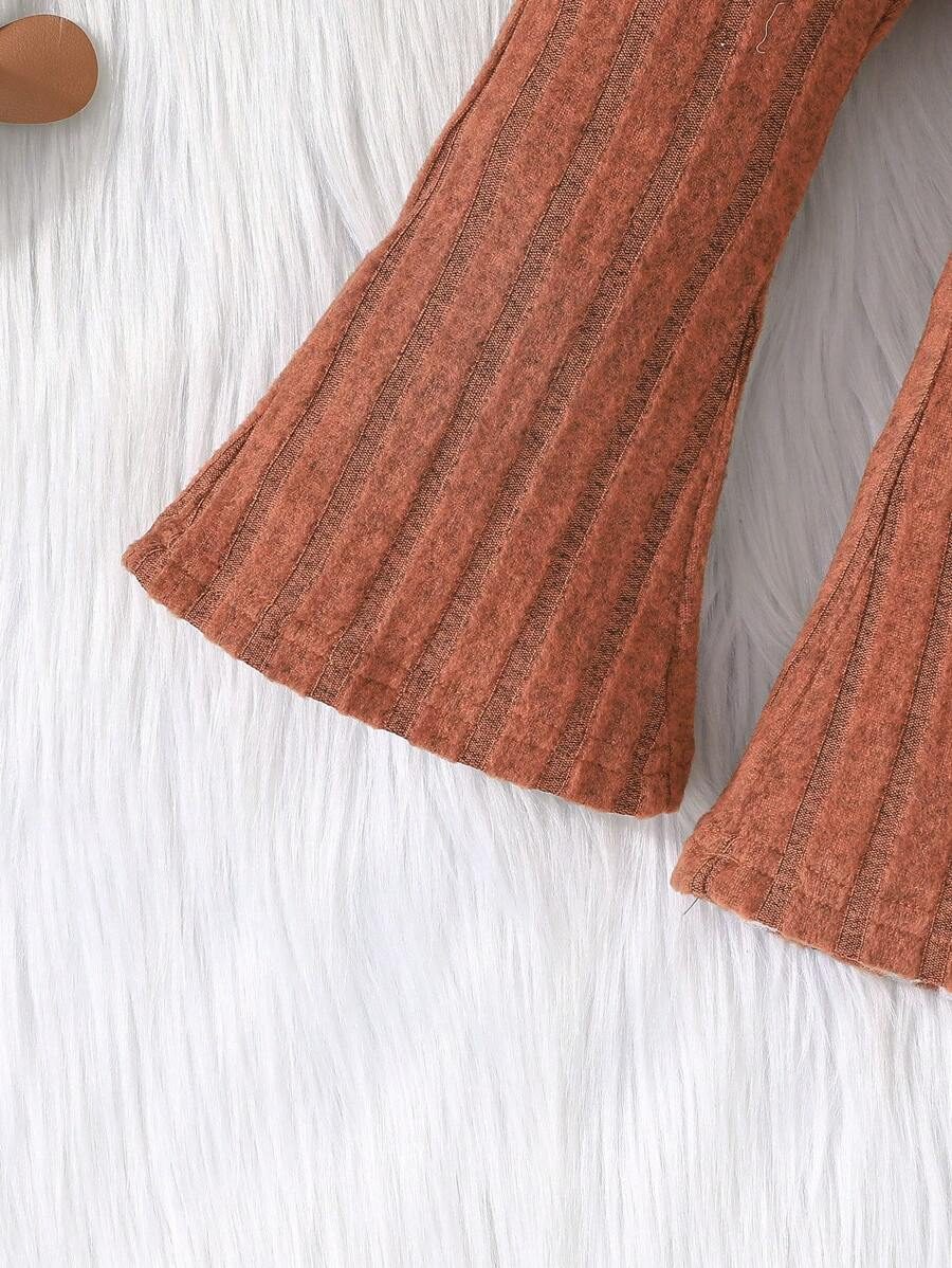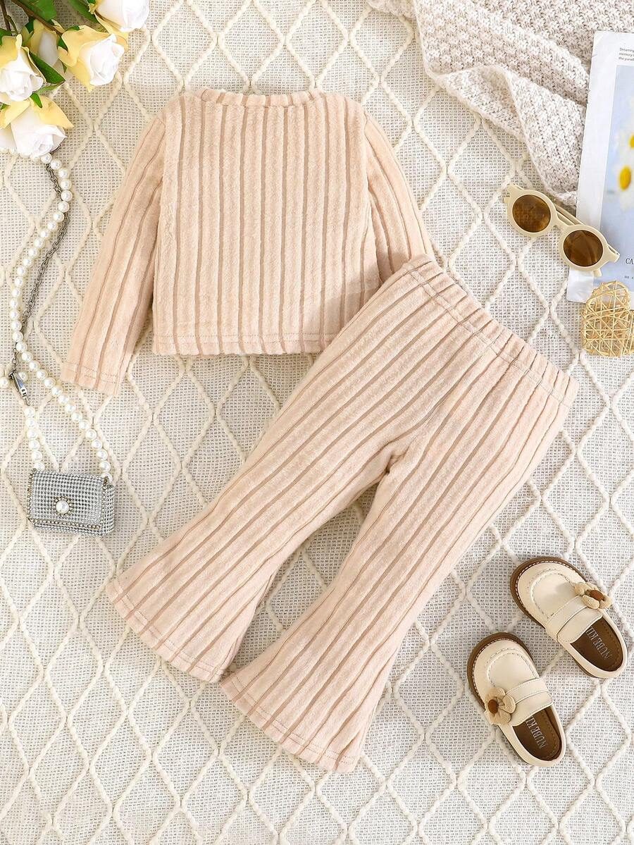 2pcs Set Baby Girls’ Ribbed Fleece Casual Outfit, Round Neck Top And Flare Pants, Spring Autumn WNTD0019