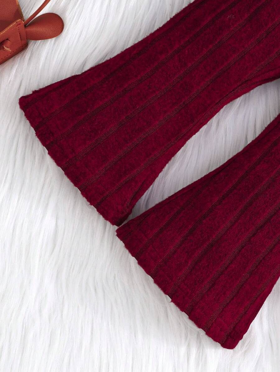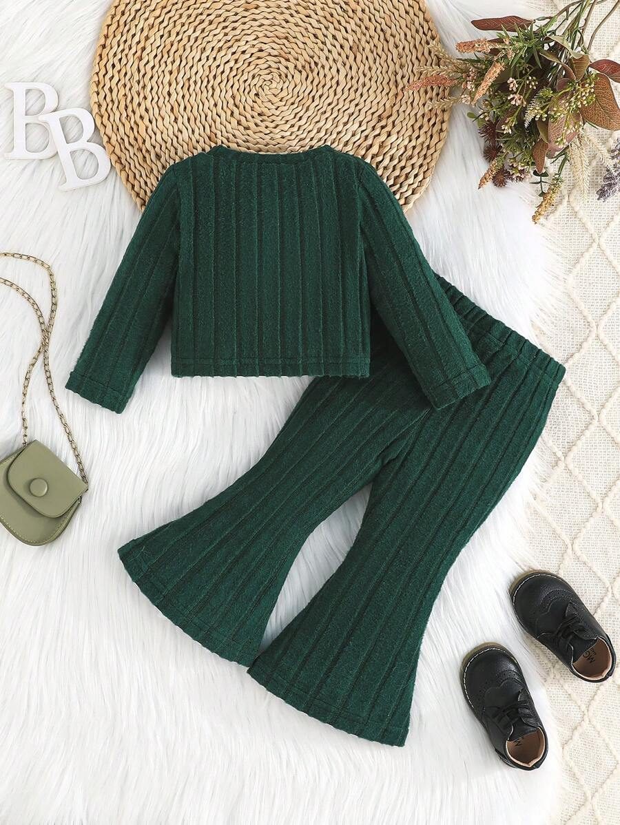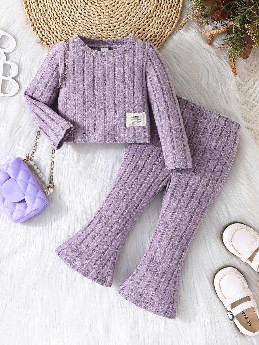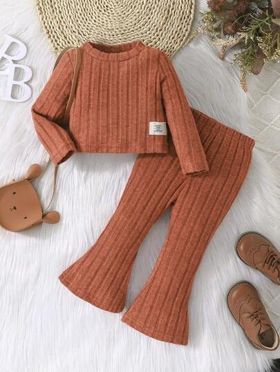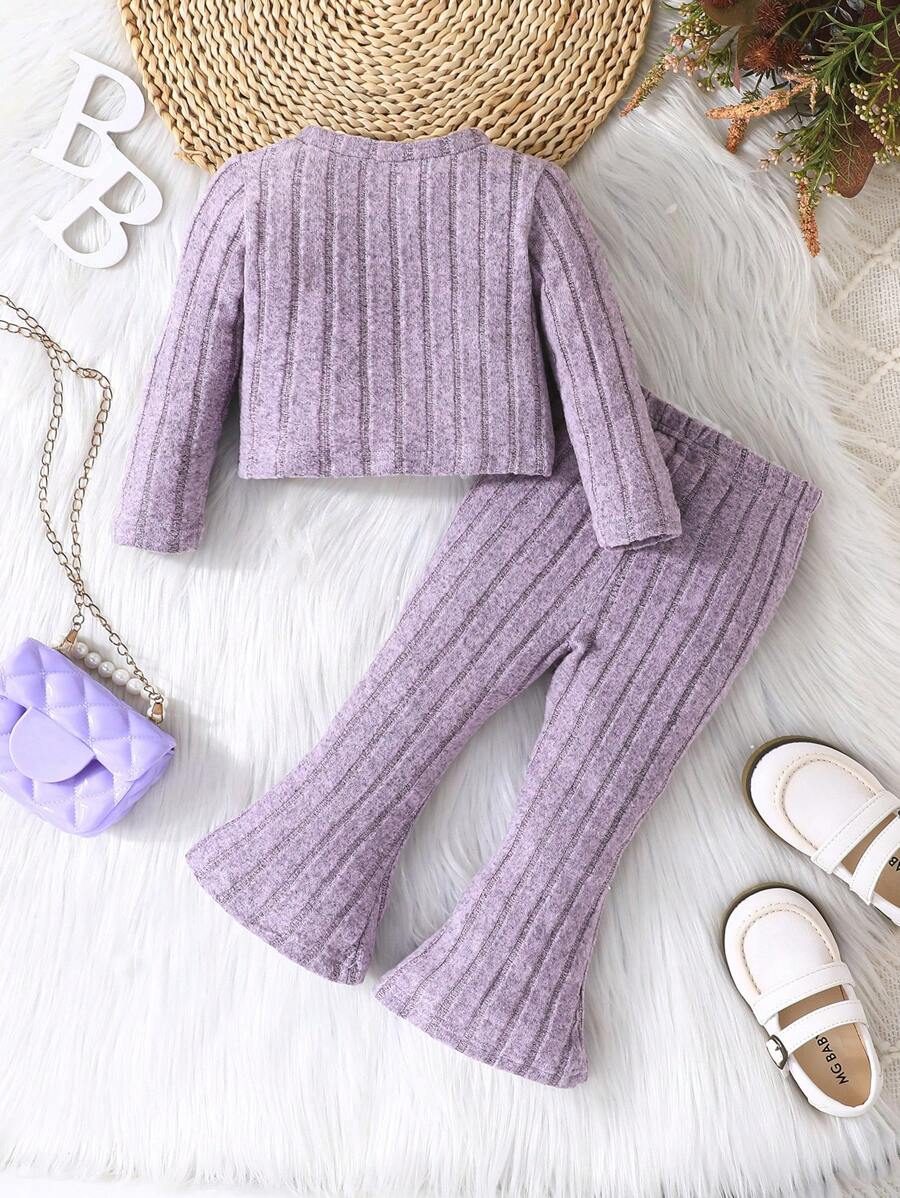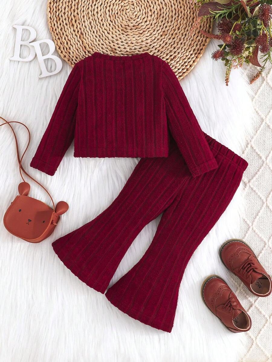 2pcs Set Baby Girls’ Ribbed Fleece Casual Outfit, Round Neck Top And Flare Pants, Spring Autumn WNTD0019