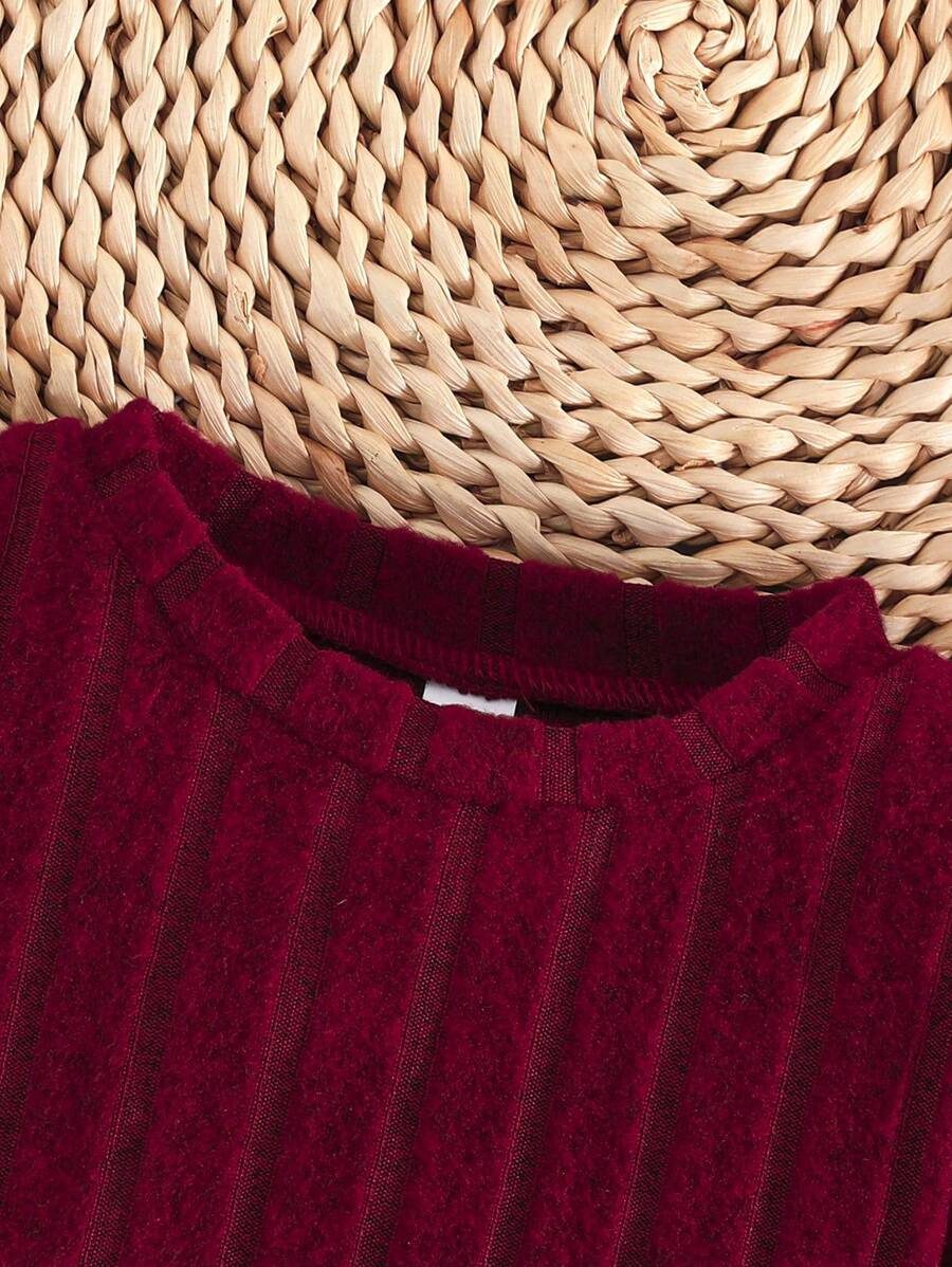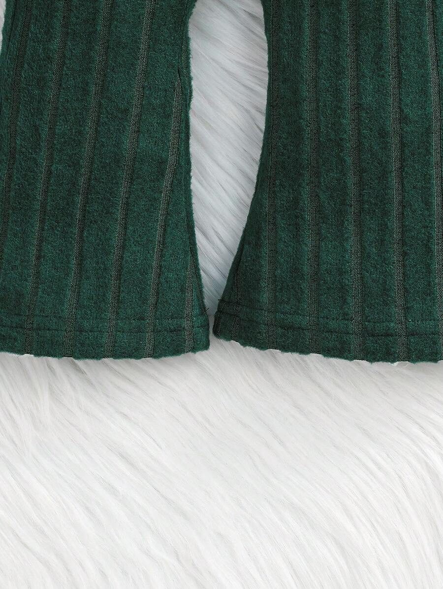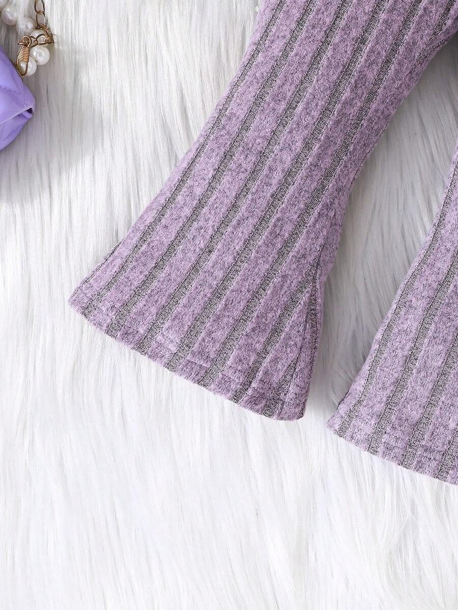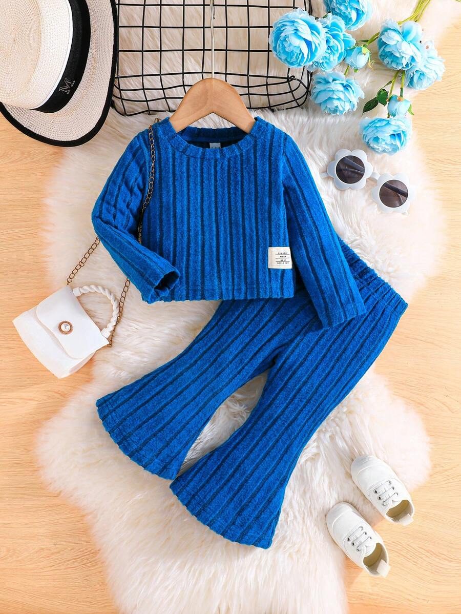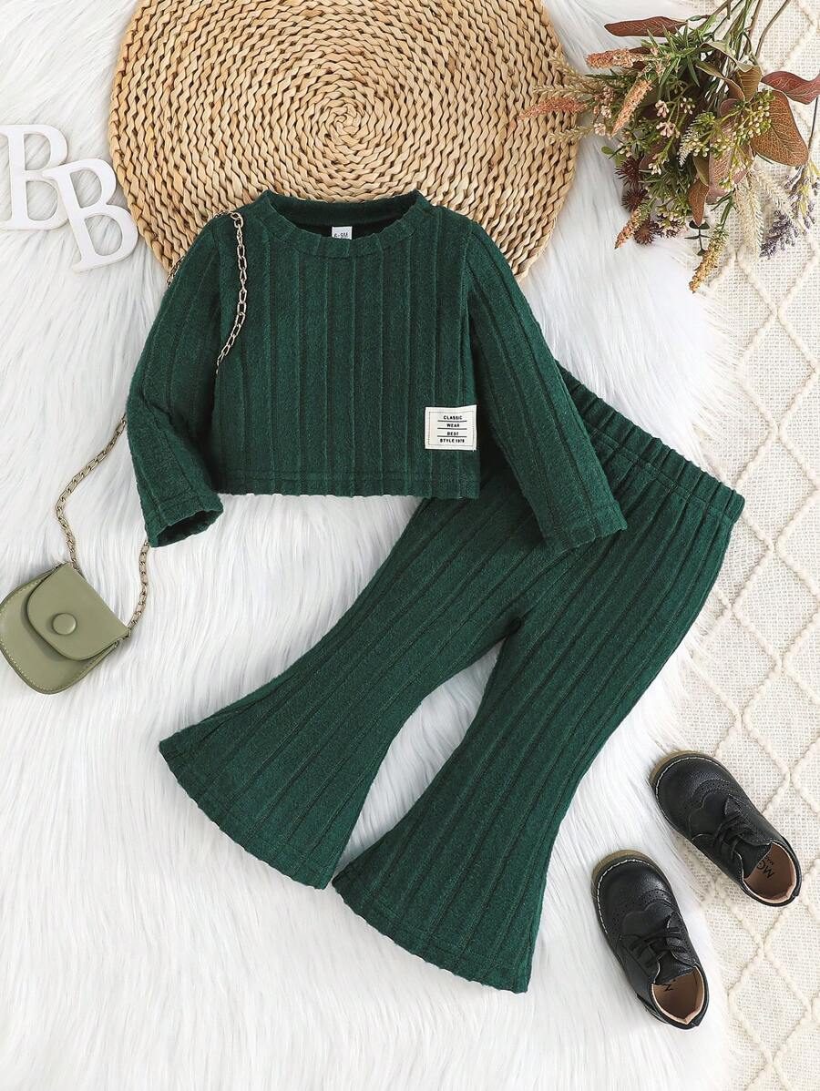 2pcs Set Baby Girls’ Ribbed Fleece Casual Outfit, Round Neck Top And Flare Pants, Spring Autumn WNTD0019