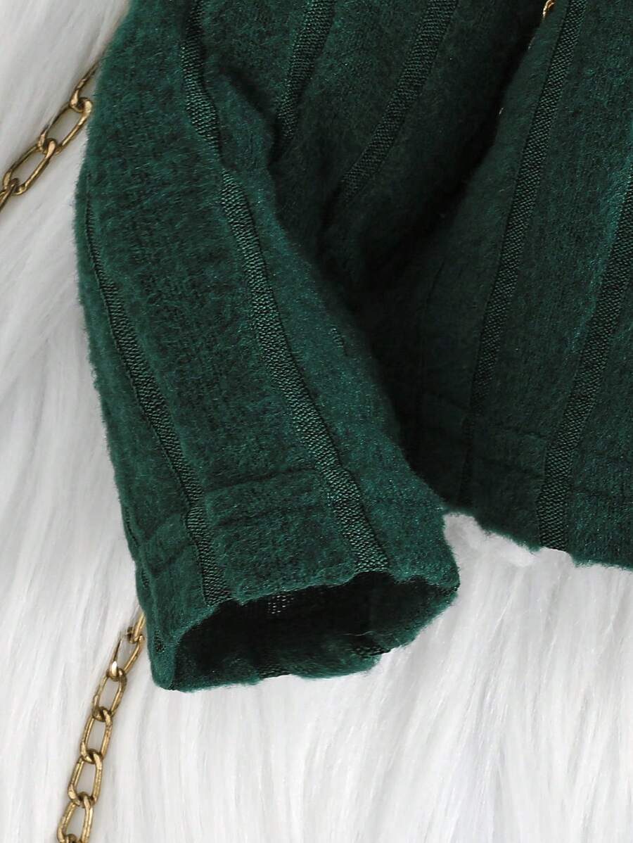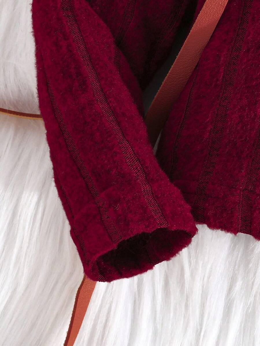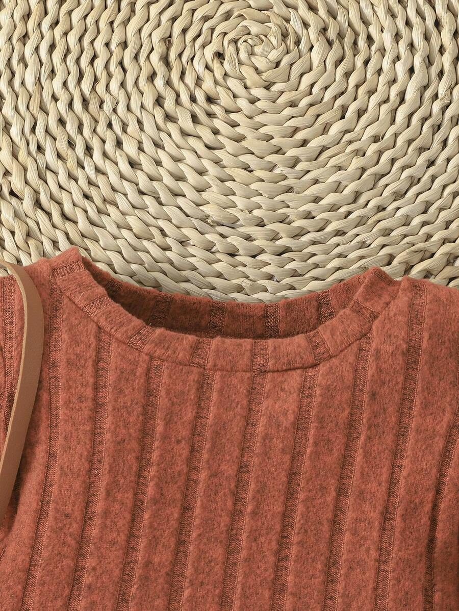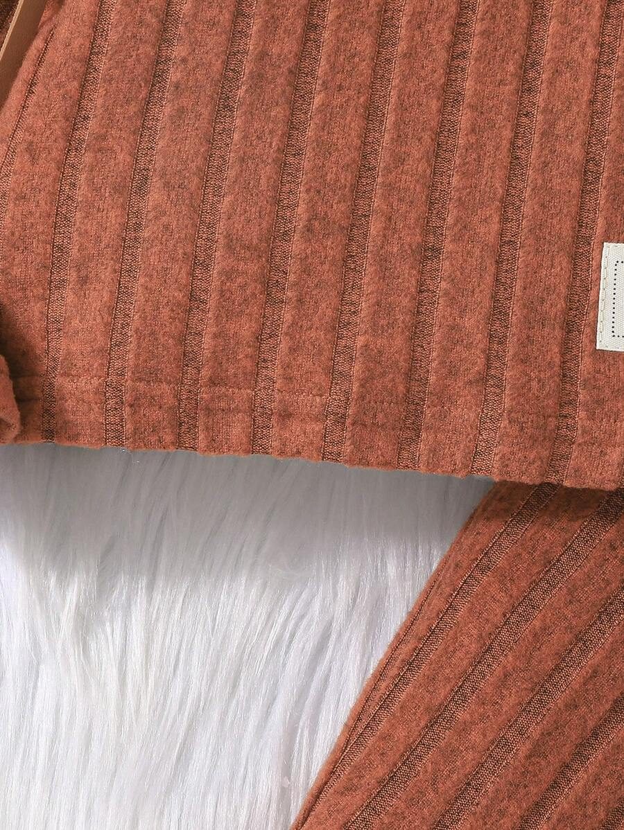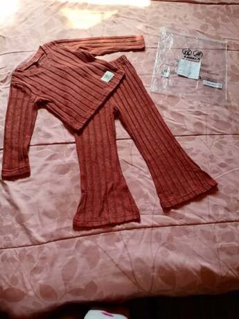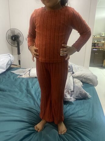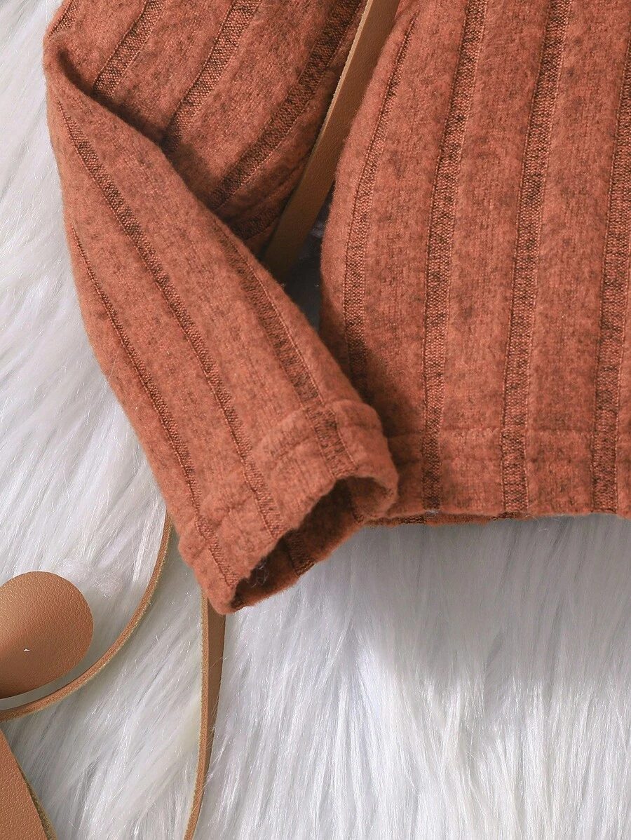 I absolutely love this two-piece set for my little one! The ribbed knit fabric is soft, warm, and super comfortable, perfect for cooler days. The rich rust color is beautiful and adds such a cozy, autumnal feel. I also appreciate how stretchy the material is; it allows for easy movement while still fitting nicely. The bell-bottom style on the pants adds a cute retro touch, and the top’s wide collar detail gives it a unique, stylish flair. It’s roomy enough for layering a bodysuit underneath, which is great for transitioning between seasons.