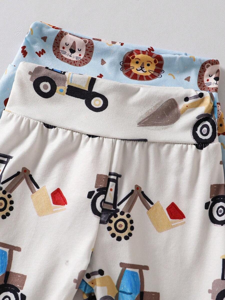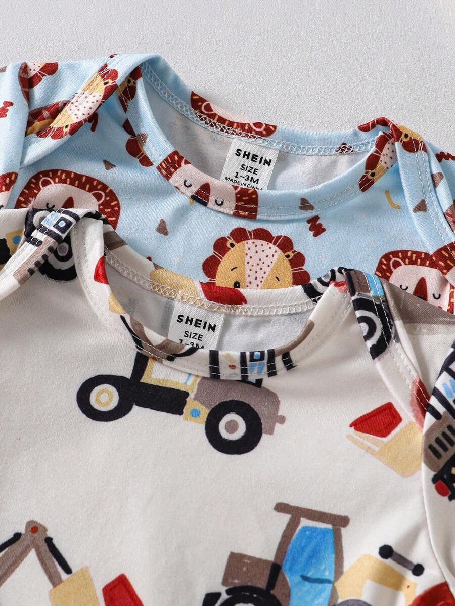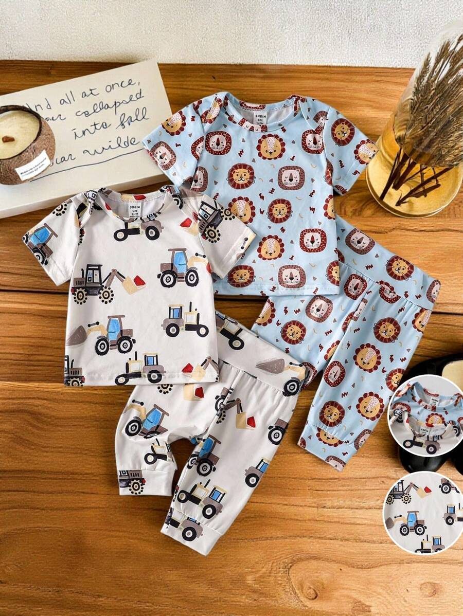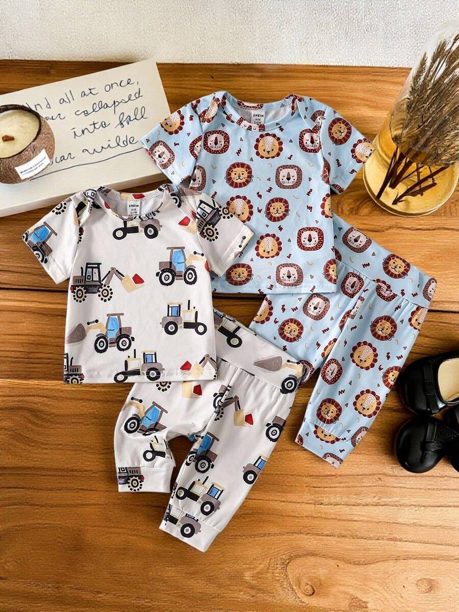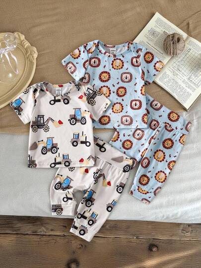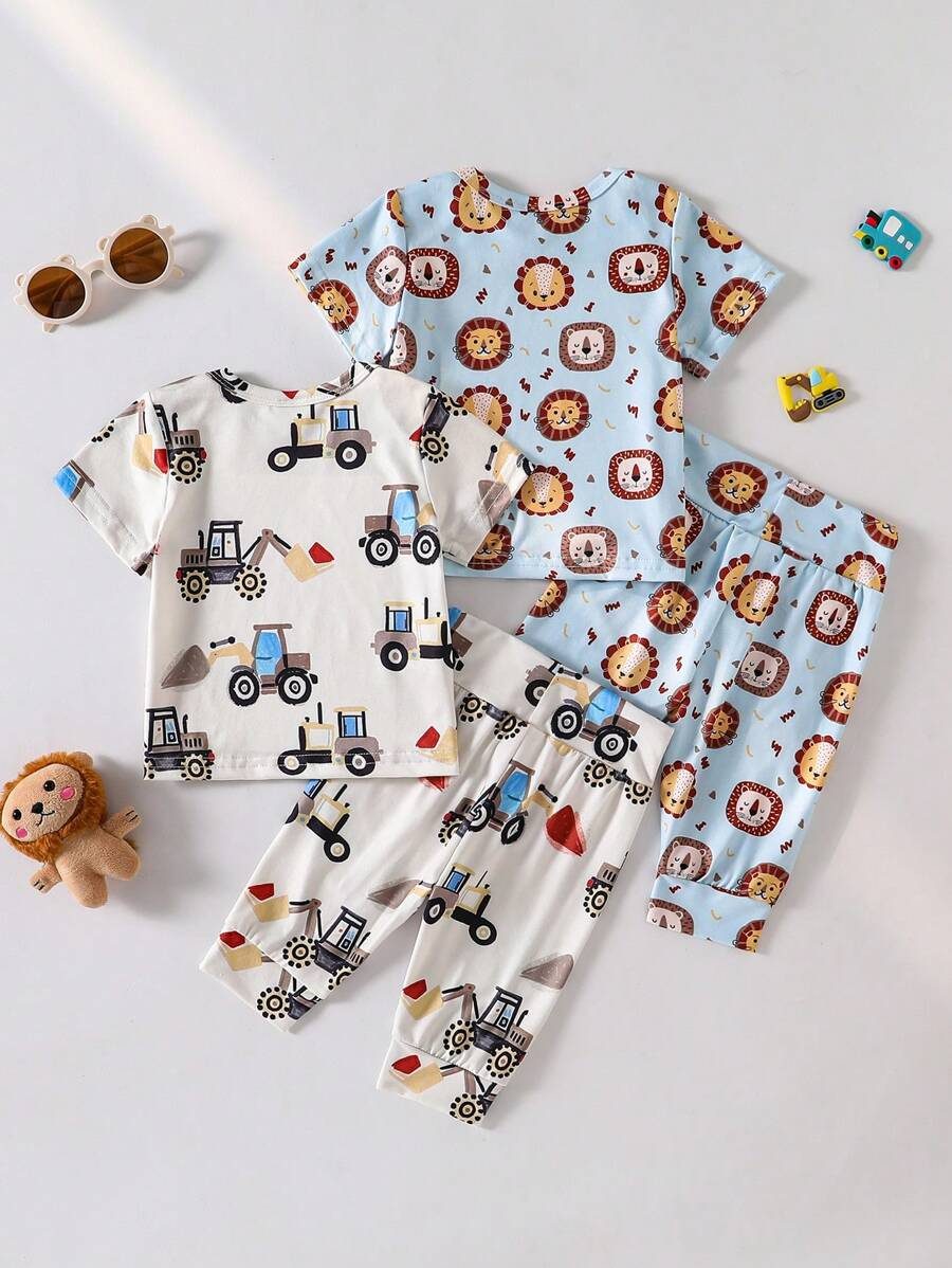 4pcs/Set Newborn Simple Fashionable Full Print Lion & Engineering Truck Pattern Short Sleeve Pants Homewear Set NB00072