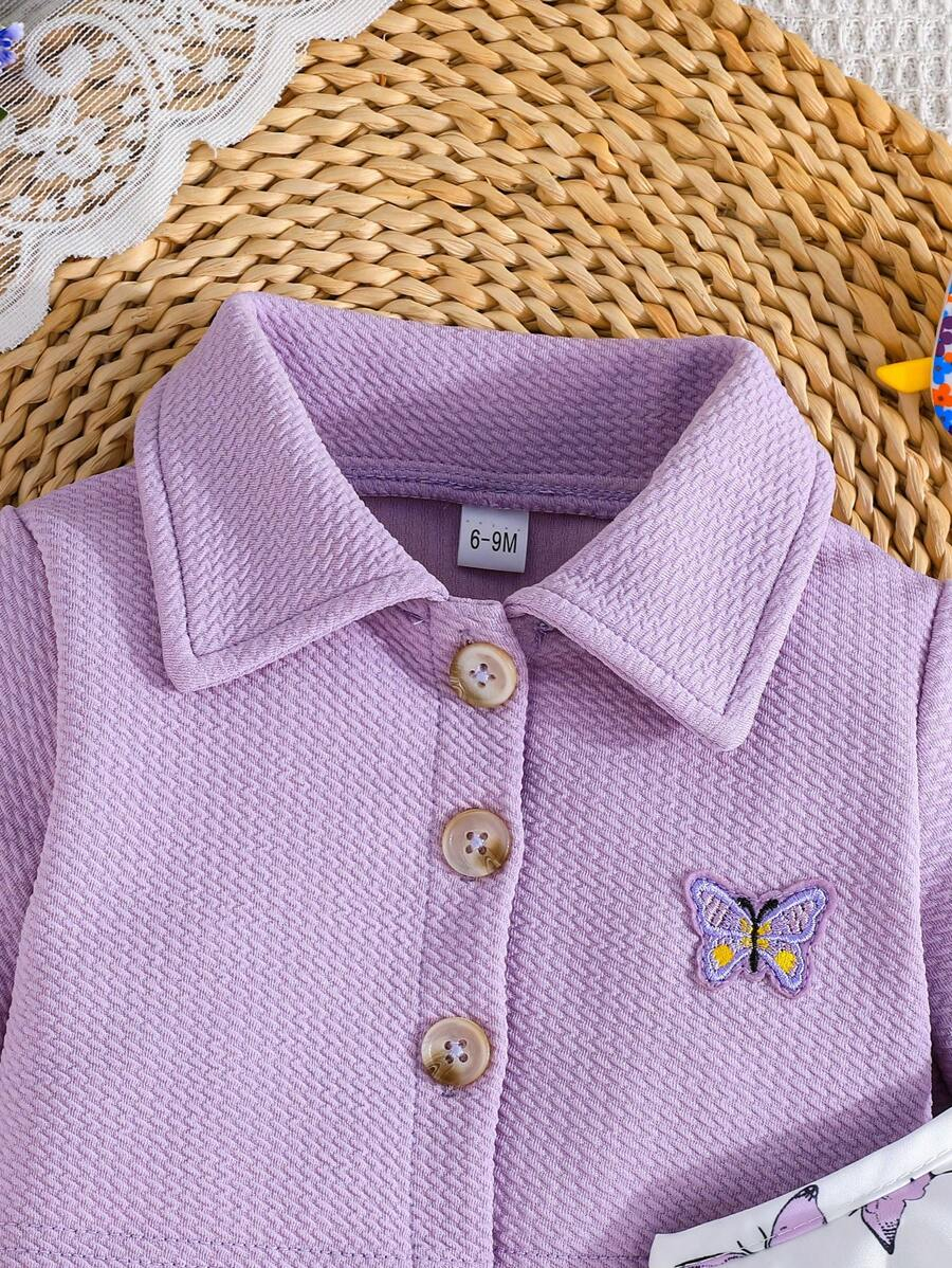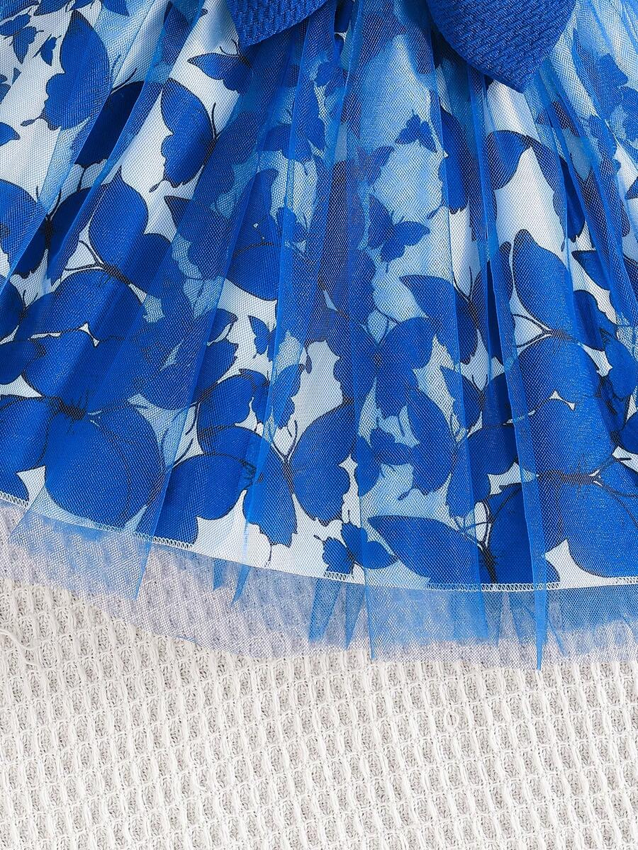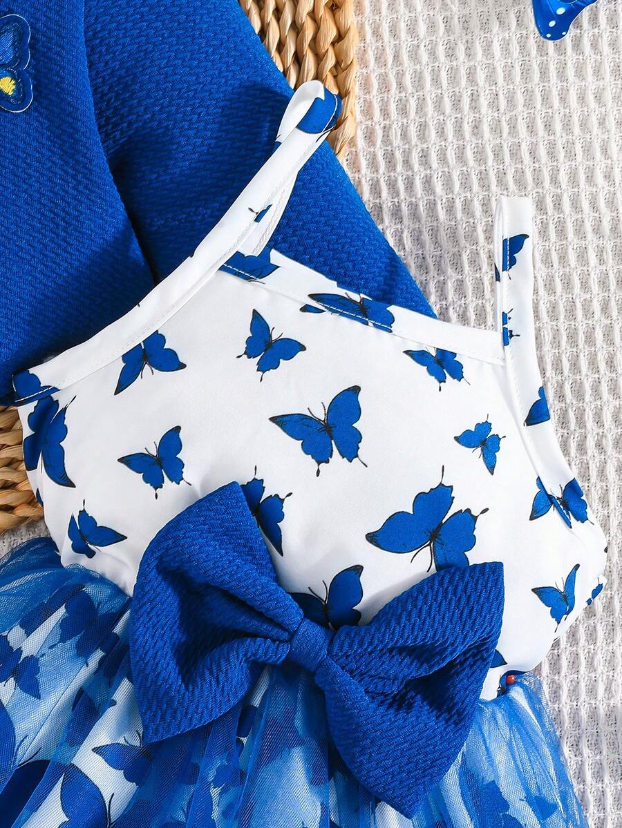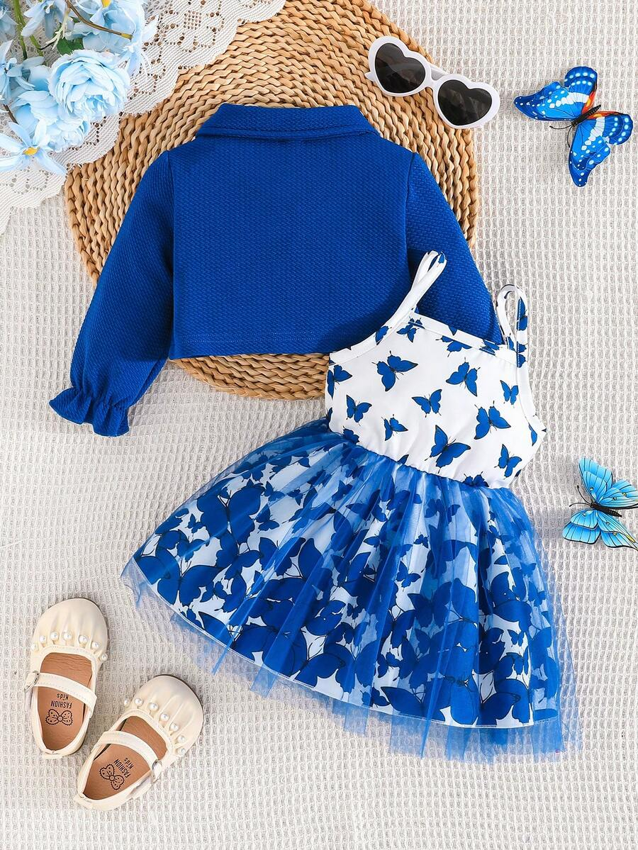 Baby Girls’ Elegant Ruffle Trim Long Sleeve Butterfly Embroidered Jacket Paired With Minimalist Butterfly Print Mesh Dress 2pcs Set WNTD0067