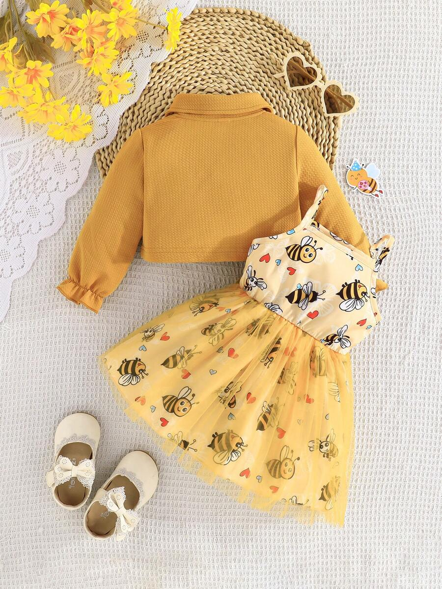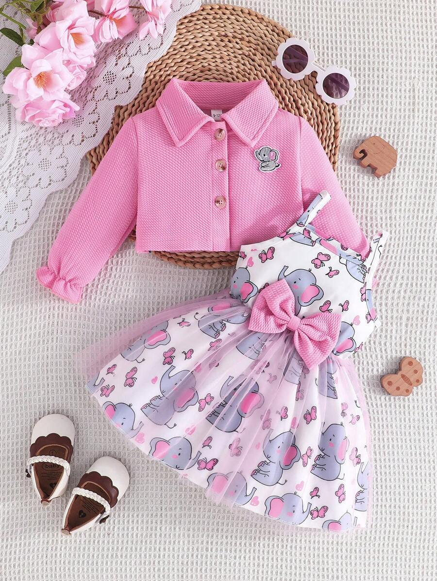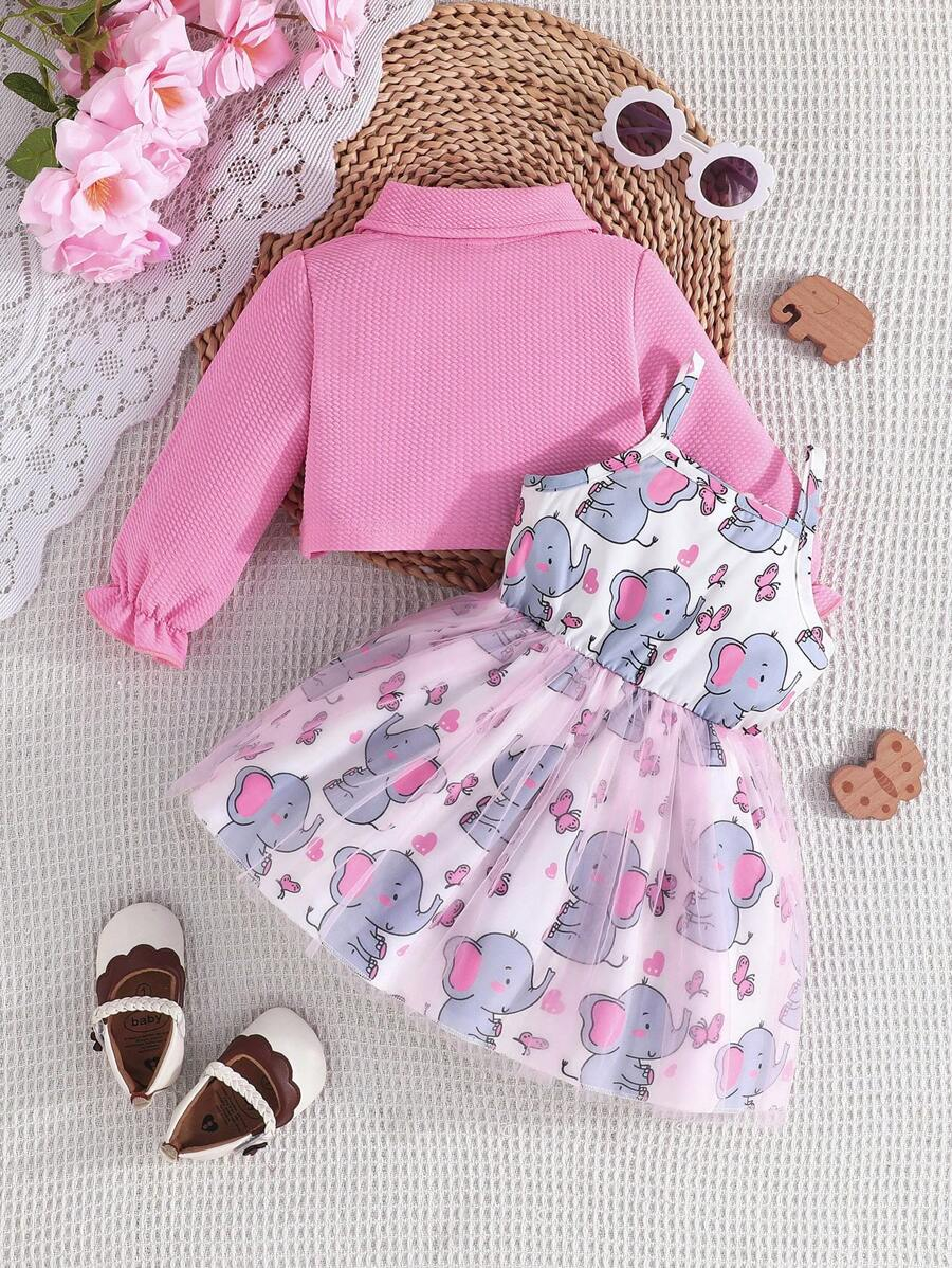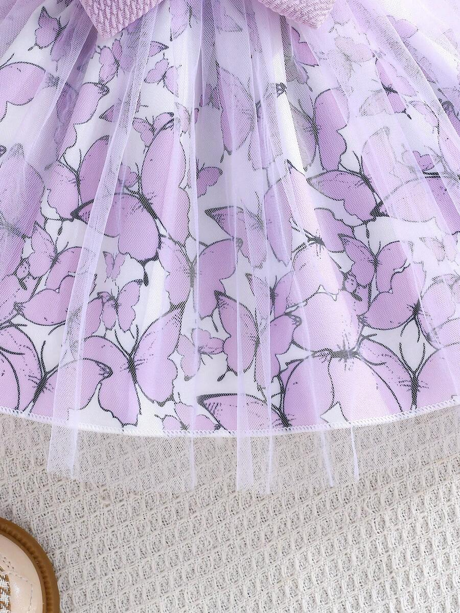Baby Girls’ Elegant Ruffle Trim Long Sleeve Butterfly Embroidered Jacket Paired With Minimalist Butterfly Print Mesh Dress 2pcs Set WNTD0067