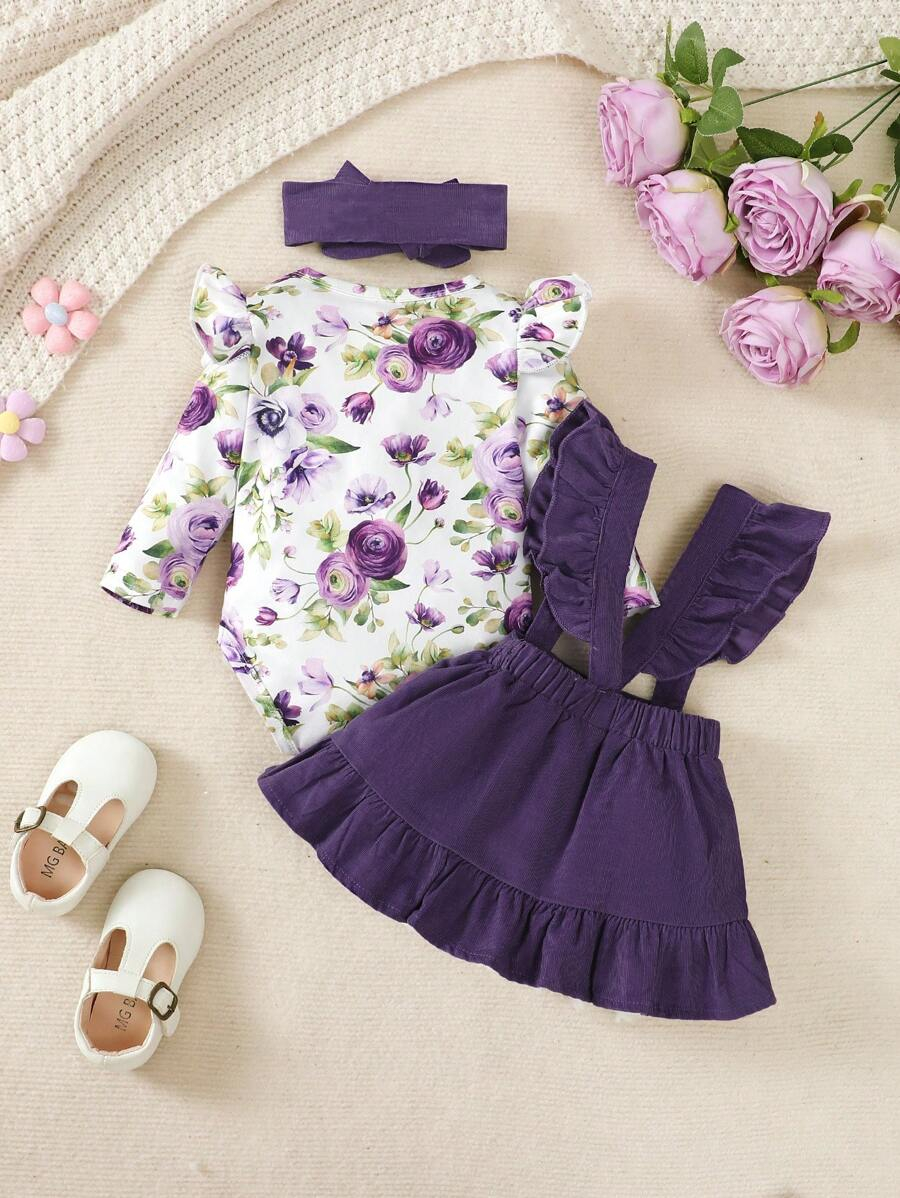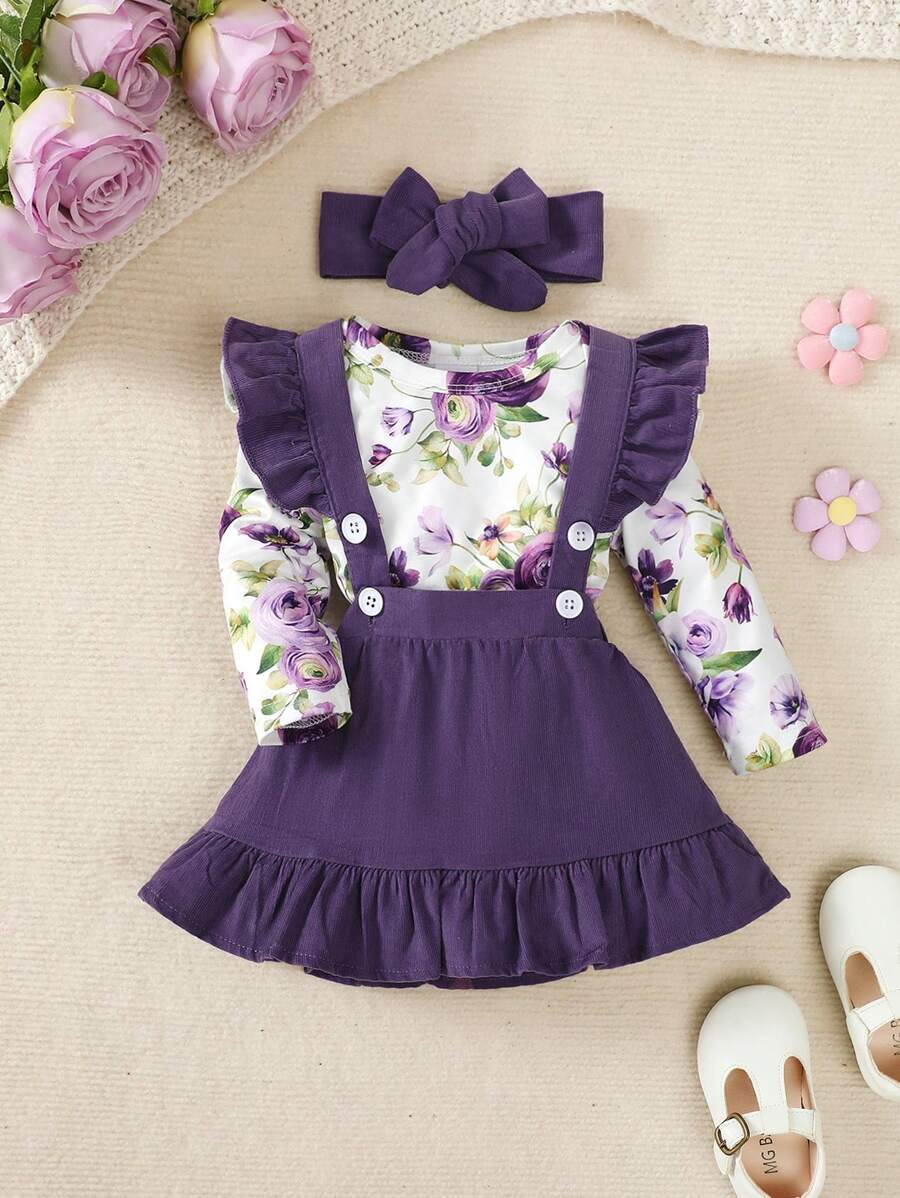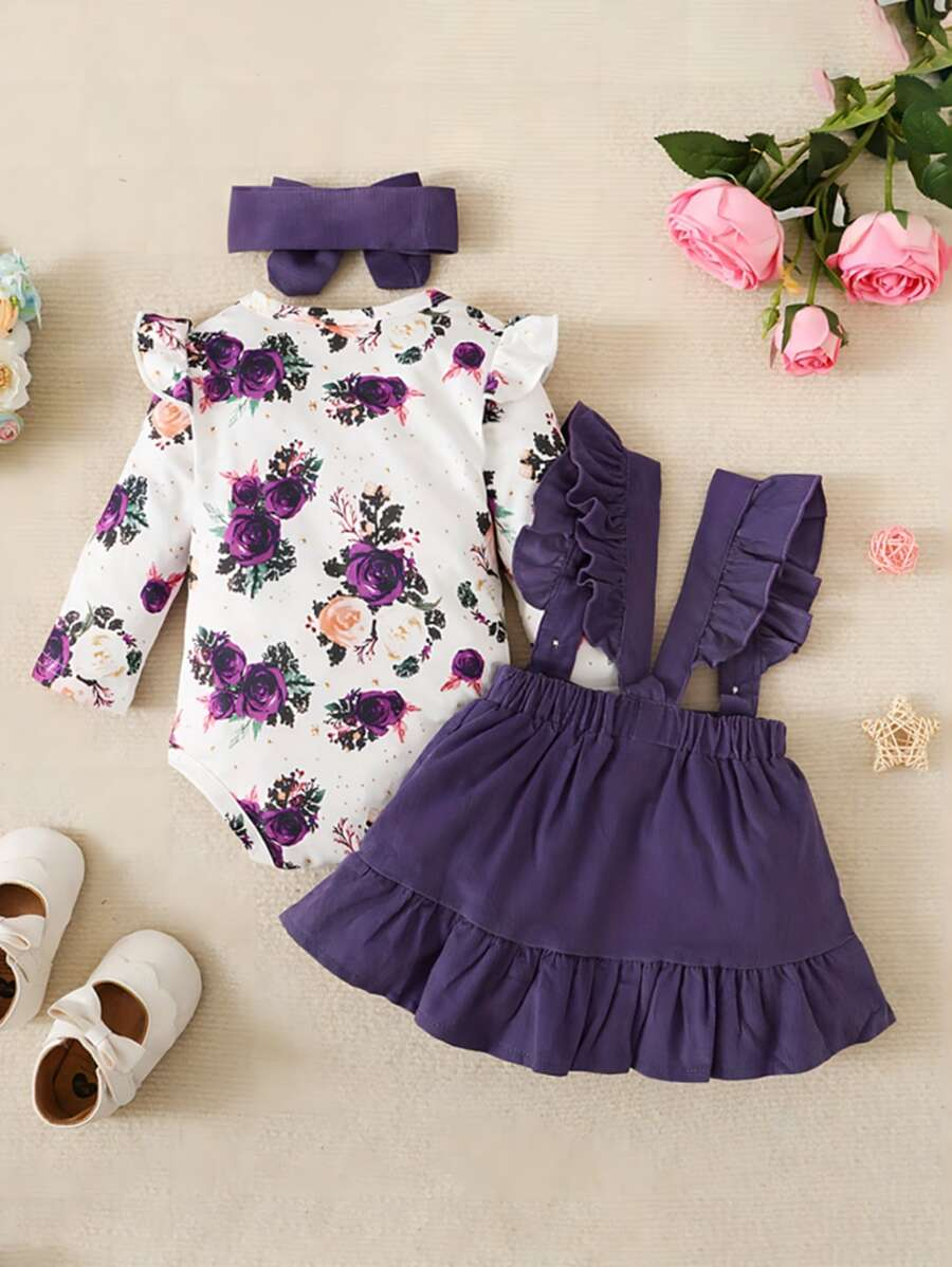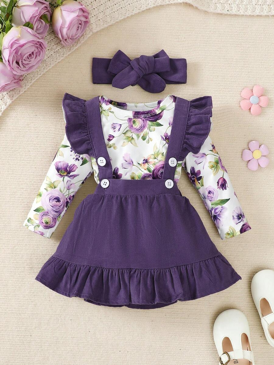 BrownBark Baby Girl 3pcs Set Ditsy Floral Long Sleeve Blouse And Solid Color Suspender Dress And Headpiece, Autumn-Winter WNTD0063