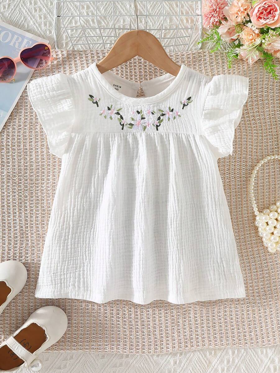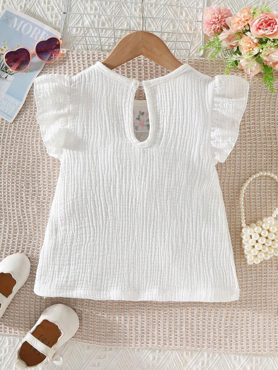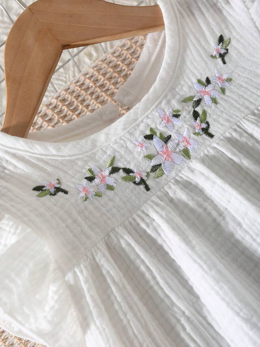Girls’ Casual Minimalist Fashion Round Neck Cap Sleeve Fitted Solid Color Floral Embroidered Cotton Blouse, Versatile Summer Top For Girls YG00093