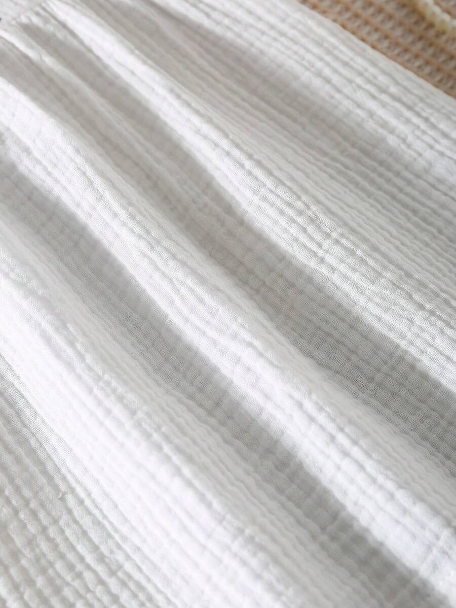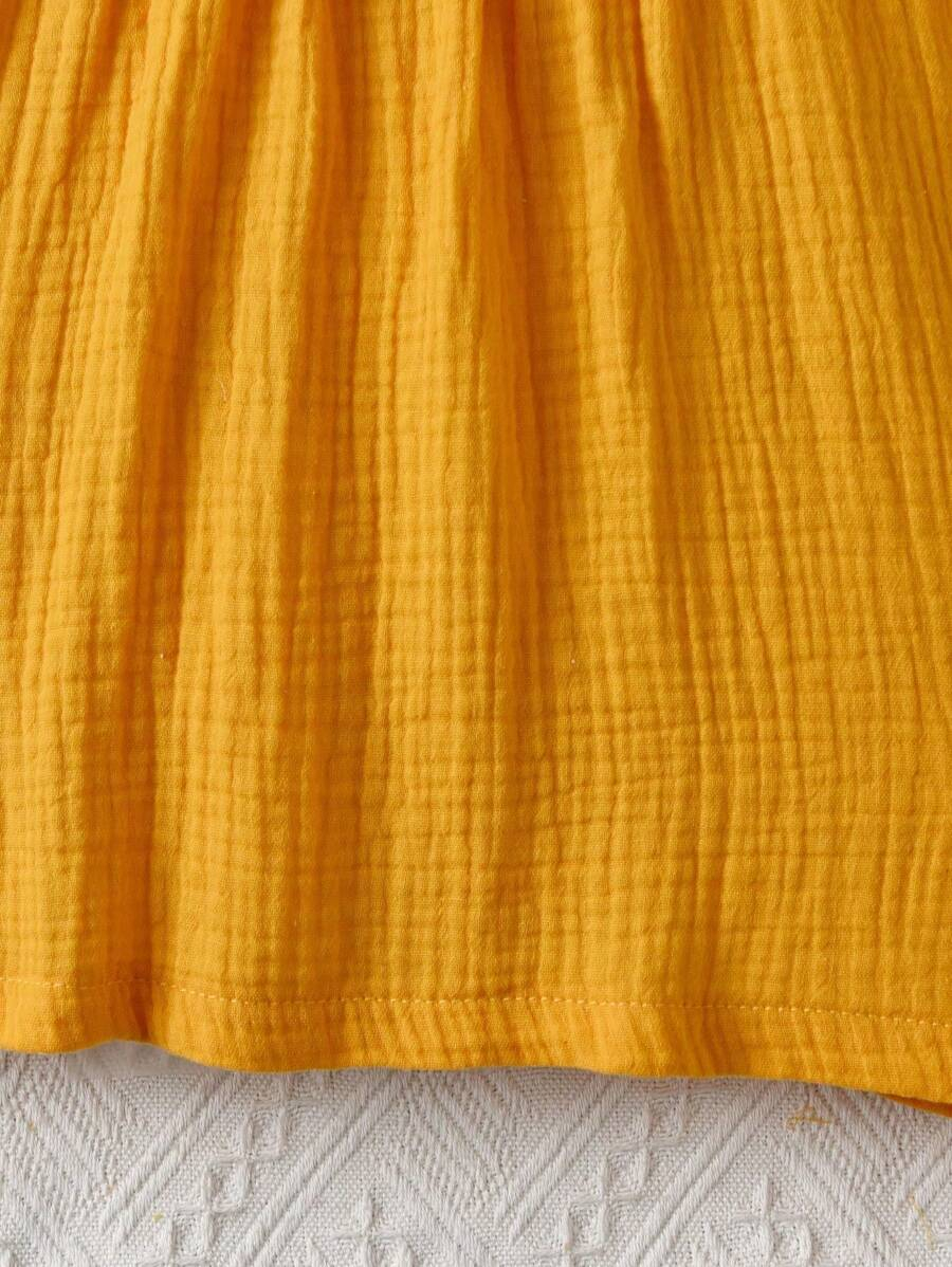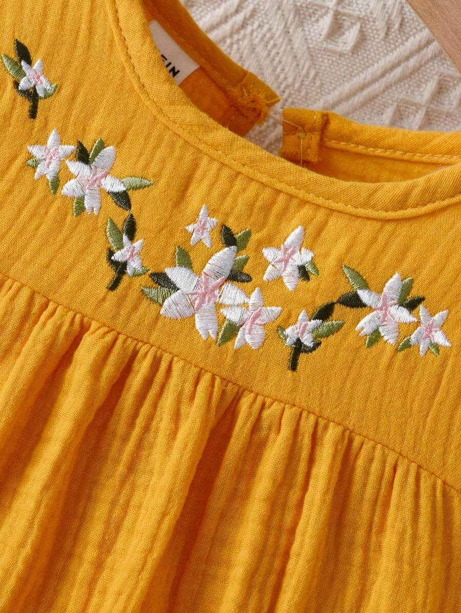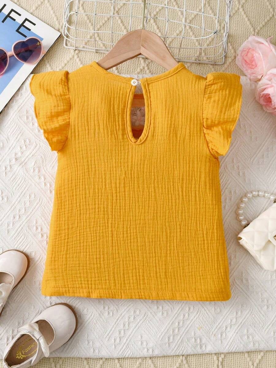 Girls’ Casual Minimalist Fashion Round Neck Cap Sleeve Fitted Solid Color Floral Embroidered Cotton Blouse, Versatile Summer Top For Girls YG00093