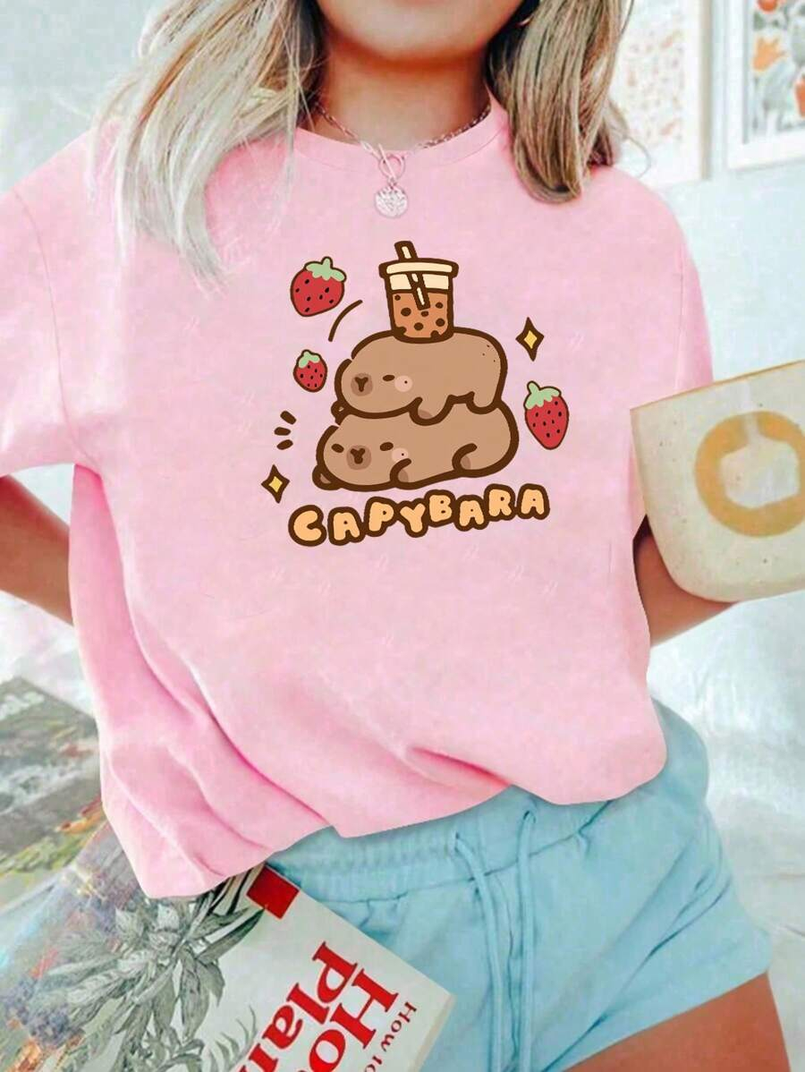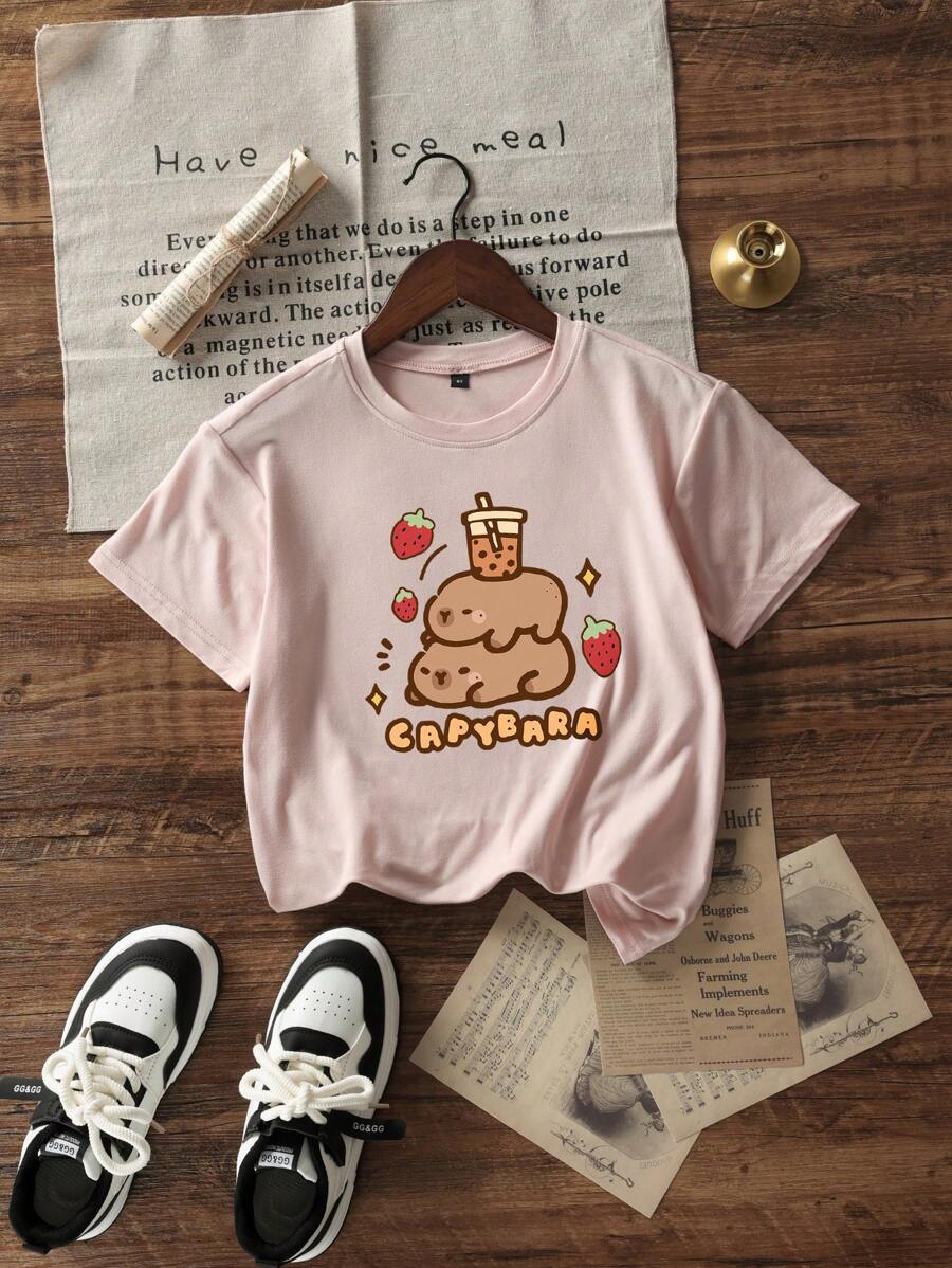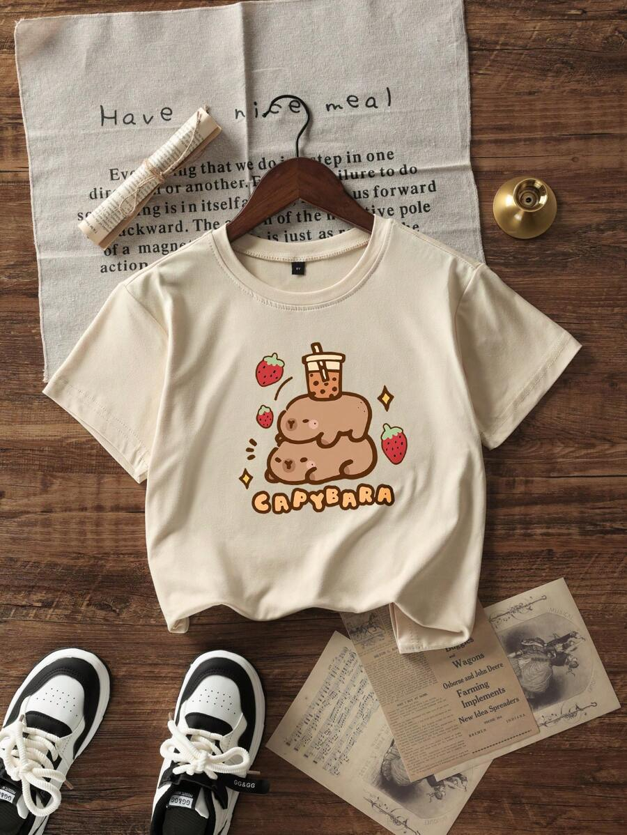 Girls & Teens Light Apricot Round Neck Casual Printed Short Sleeve T-Shirt, Summer Top