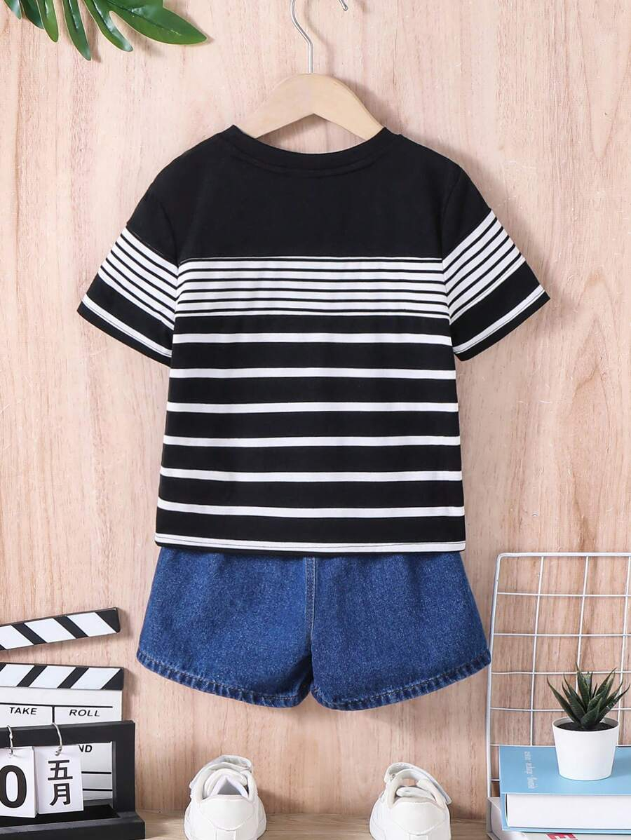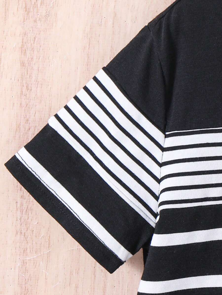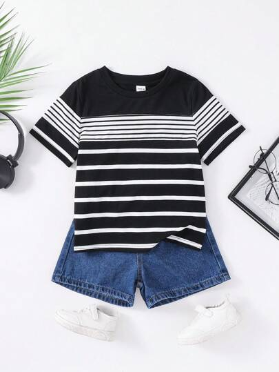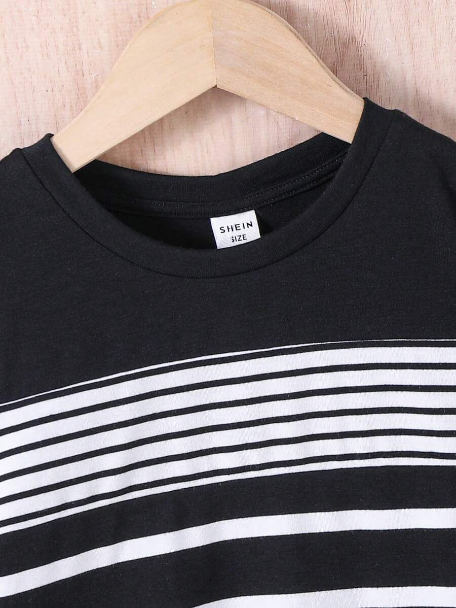 Kids Boys Casual College Style Comfy Striped Patchwork Loose Fit Crew Neck Short Sleeve Knit T-Shirt, Suitable For Commuting, School, Daily Casual, Vacation, Sports, Spring/Summer YB00097