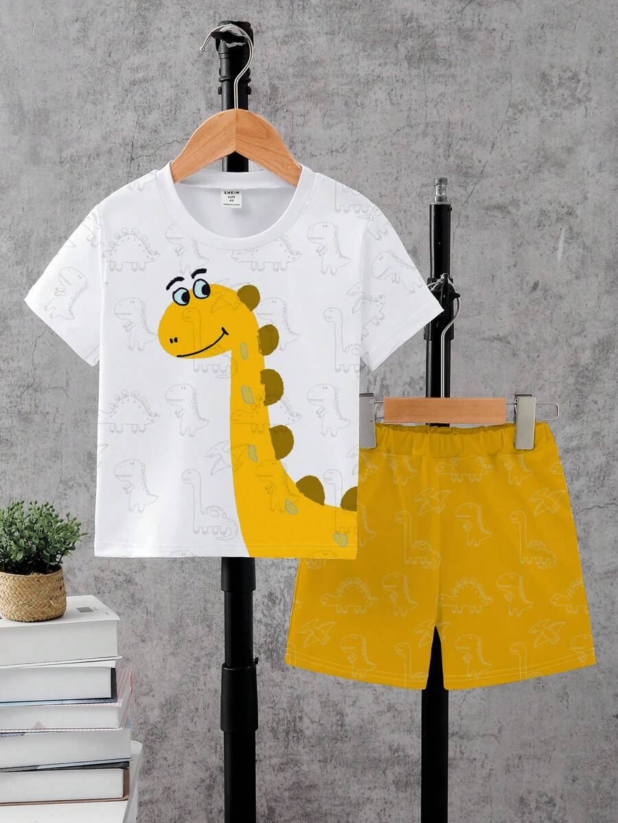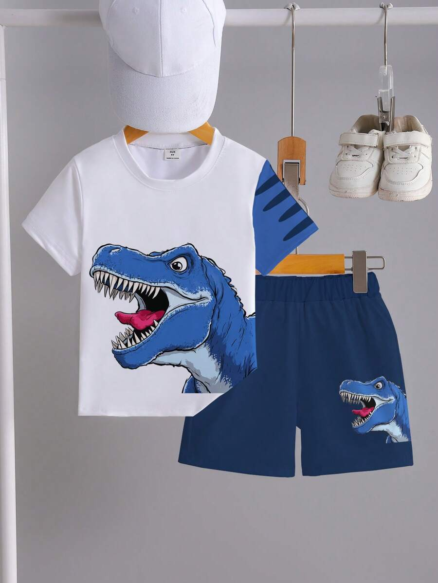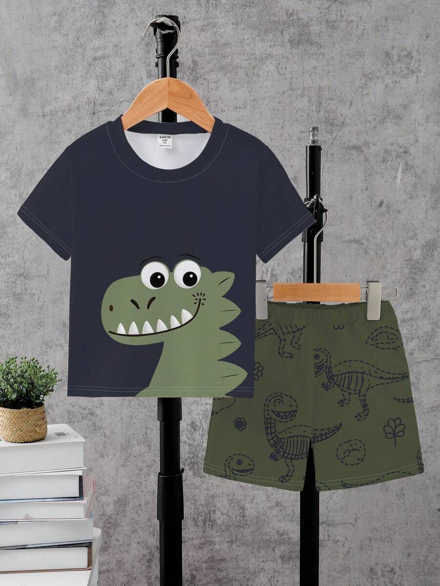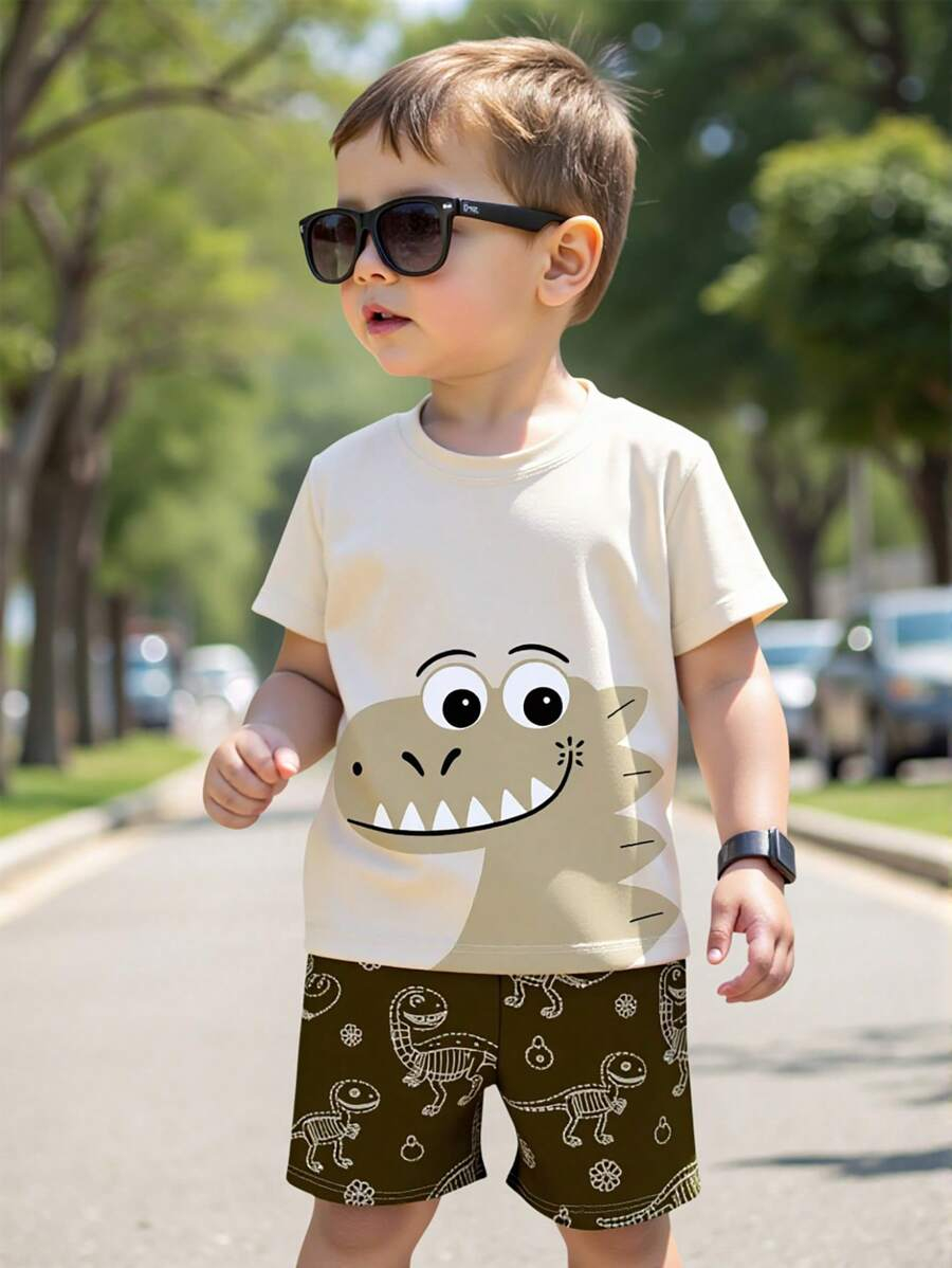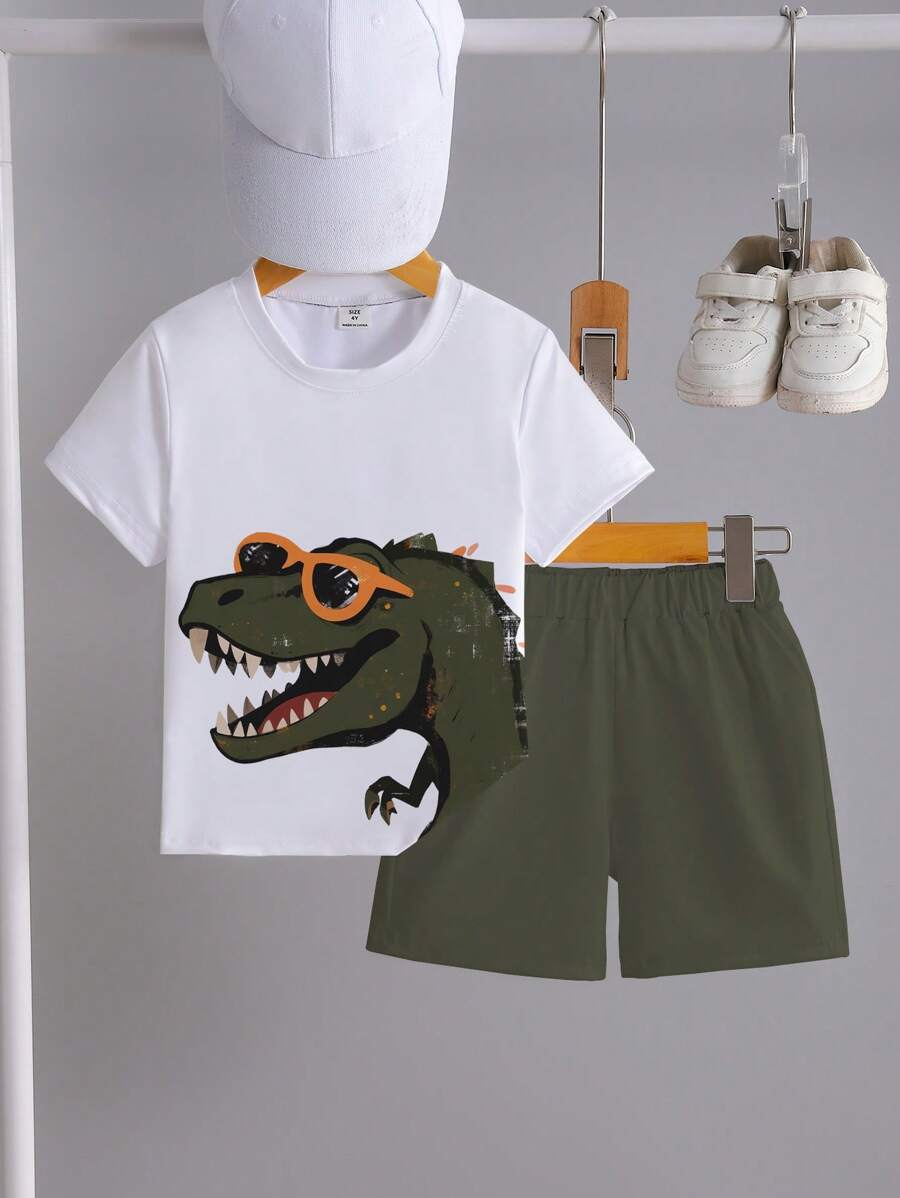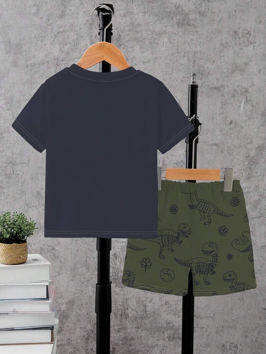 SHEIN 1 Set Toddler Boys Cartoon Dinosaur Print Short Sleeve T-Shirt And Shorts Set, Lightweight For Daily Wear, Suitable For Spring/Summer Dinosaur Clothes For Boys Summer Holiday YB00009